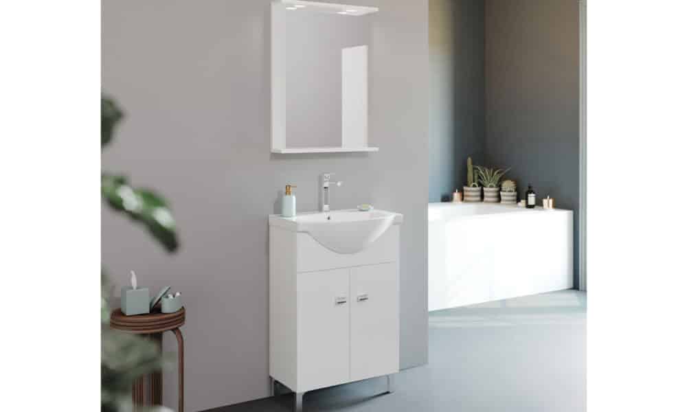 • Configurație: bază cu uși și sertare + lavoar ceramic + oglindă cu dulăpior