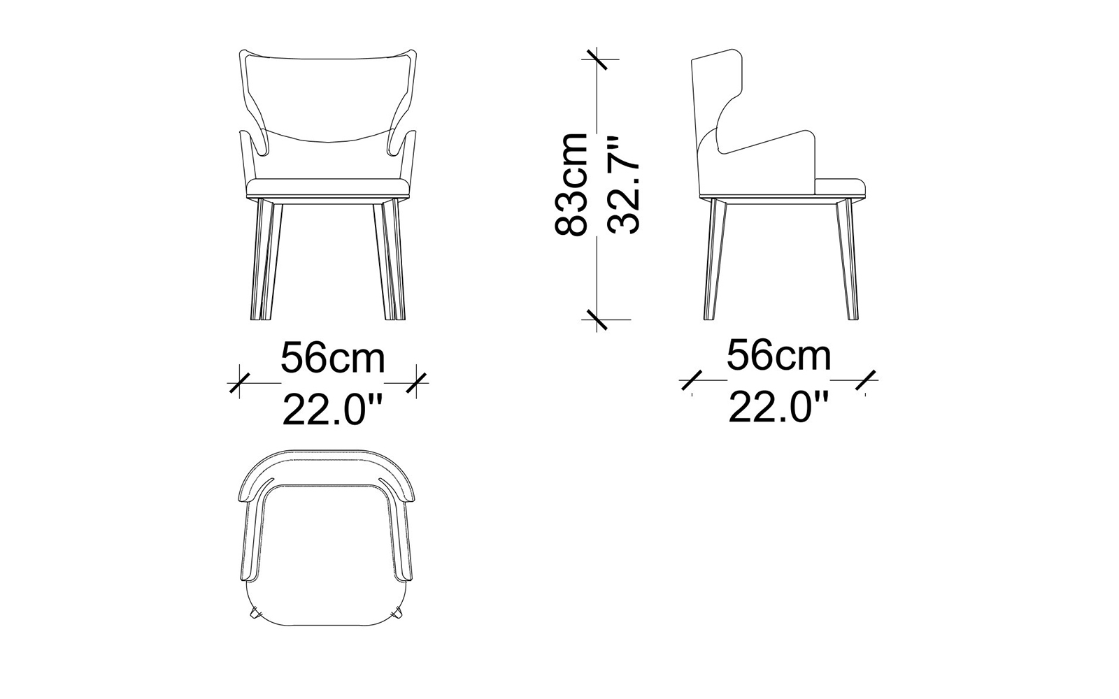 Proporțiile fotoliului sunt atent calculate pentru a oferi confort real fără a ocupa excesiv spațiul. Nova Armchair are o lățime de 56 cm și o adâncime de 56 cm, dimensiuni care permit o poziție relaxată și naturală a corpului, menținând în același timp un profil compact și ușor de integrat în jurul meselor de dining sau în zonele de conversație. Înălțimea totală de 83 cm conferă spătarului o prezență elegantă și bine proporționată, susținând corect zona lombară și spatele superior, fără a domina vizual încăperea.