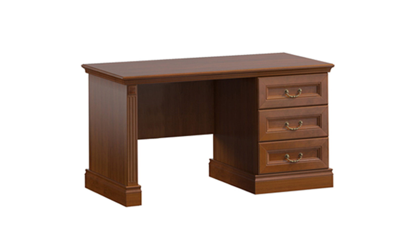 Blatul de lucru, placat cu furnir natural, oferă o suprafață generoasă, rezistentă și plăcută la atingere, perfectă pentru a susține activitățile zilnice, fie că este vorba despre lucru la computer, documente sau activități creative. Cele trei sertare sunt echipate cu ghidaje cu închidere automată, un detaliu modern care adaugă confort și protecție, asigurând o utilizare lină și silențioasă în fiecare zi.
