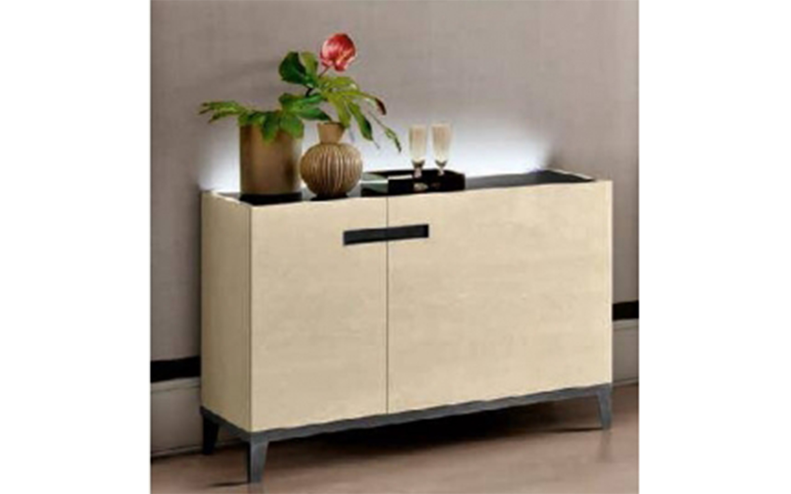 Designul său modern se distinge prin liniile simple și clare, proporțiile atent echilibrate și finisajele de calitate, care îi oferă un aspect sofisticat și versatil. Cele două uși frontale ascund un spațiu interior generos, ideal pentru depozitarea veselei, textilelor, accesoriilor de dining sau a altor obiecte personale, menținând astfel un ambient ordonat și elegant.