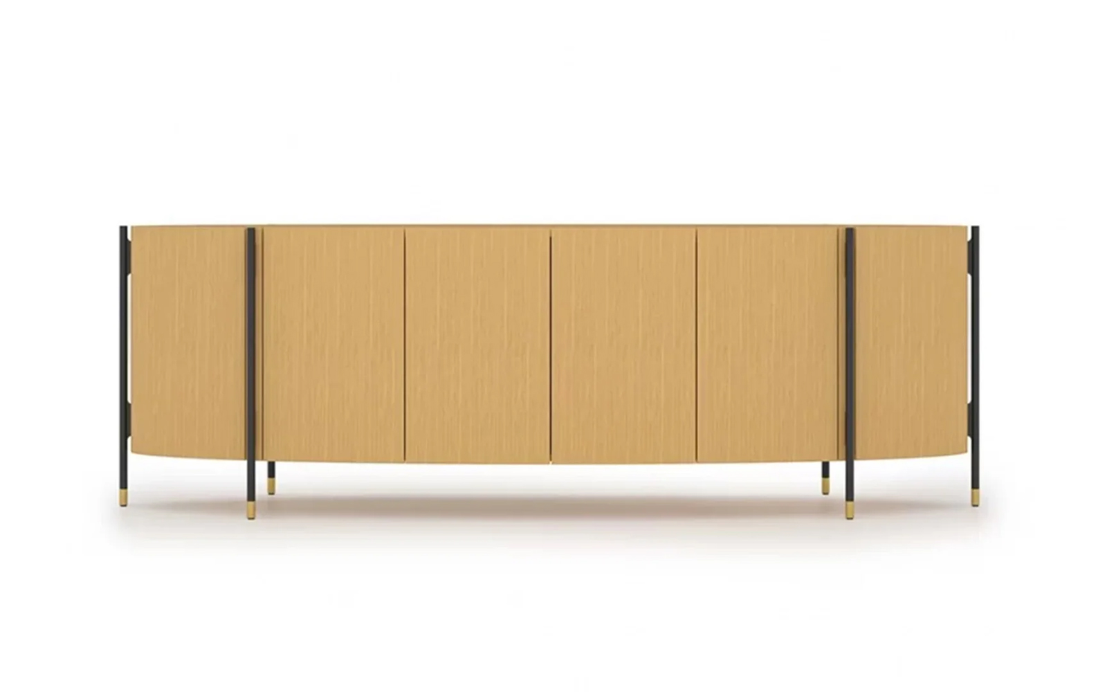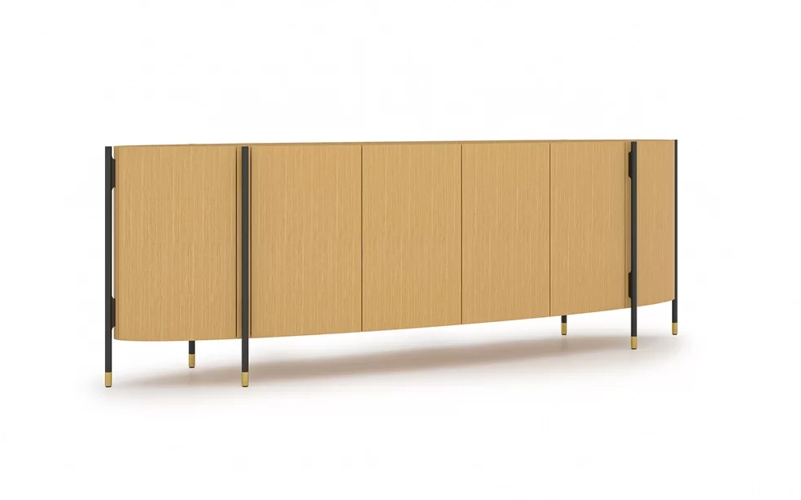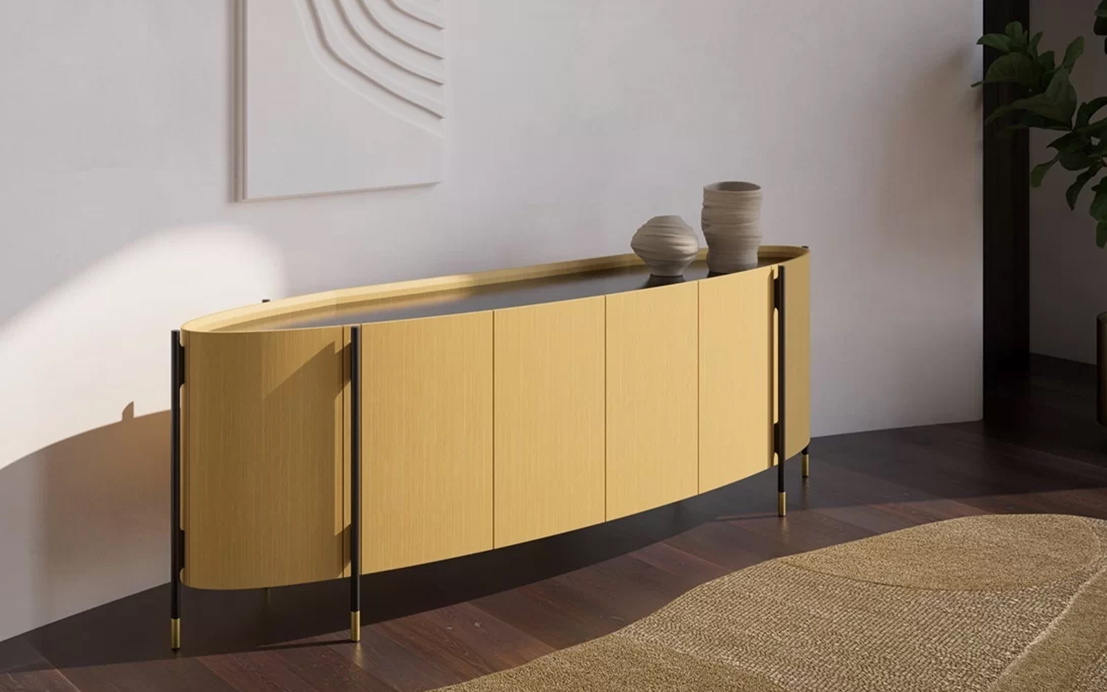 Structura impunătoare este realizată din lemn natural finisat în tonuri de ciocolată închisă, punând în valoare frumusețea naturală a esenței lemnoase. Fațada este marcată de un contrast spectaculos: o bandă bej satinat traversează întreaga lungime a piesei, aducând un rafinament subtil și accentuând forma curbată. Acest joc de culoare și textură este completat de picioare înalte și elemente verticale din metal auriu mat, ce conferă bufetului un aer nobil și ușor art-deco.