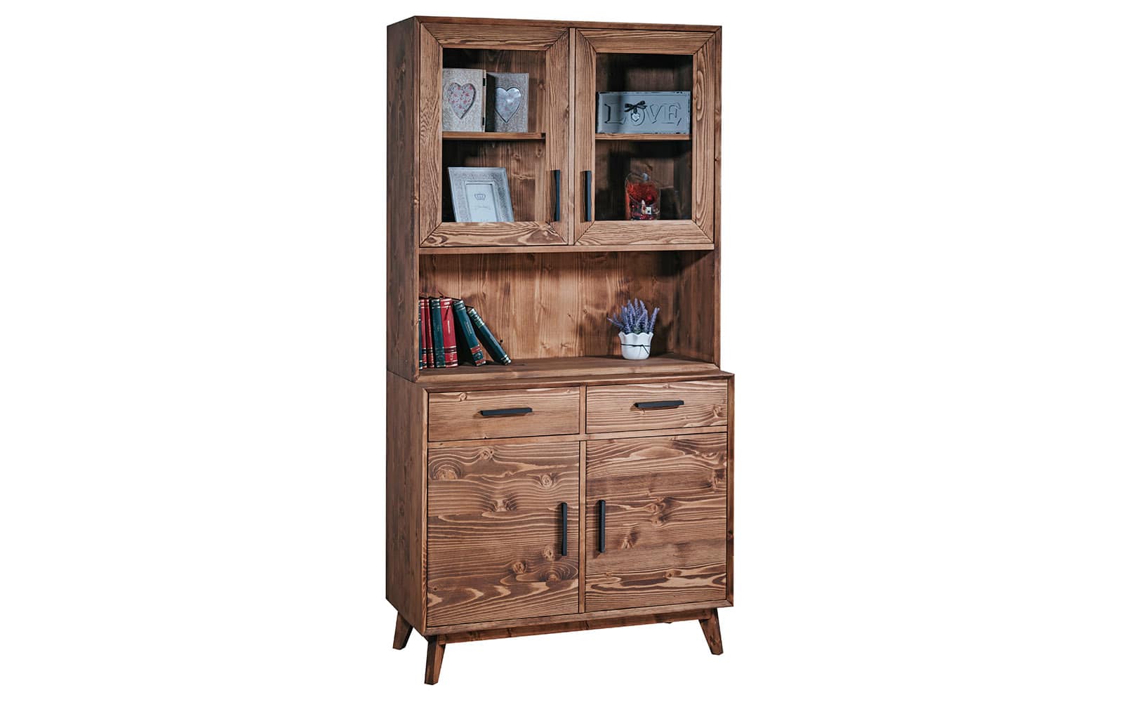 Partea inferioară este prevăzută cu două uși pline și două sertare generoase, ideale pentru organizarea accesoriilor, tacâmurilor sau a obiectelor de uz zilnic, păstrându-le mereu la îndemână, dar ferite de priviri. Partea superioară este concepută sub forma unei vitrine cu două uși din sticlă transparentă, perfecte pentru expunerea colecțiilor, a decorațiunilor deosebite sau a veseliei fine. Spațiul dintre corpuri creează o zonă deschisă, practică și decorativă, ce poate fi folosită pentru cărți, plante sau obiecte de artă.