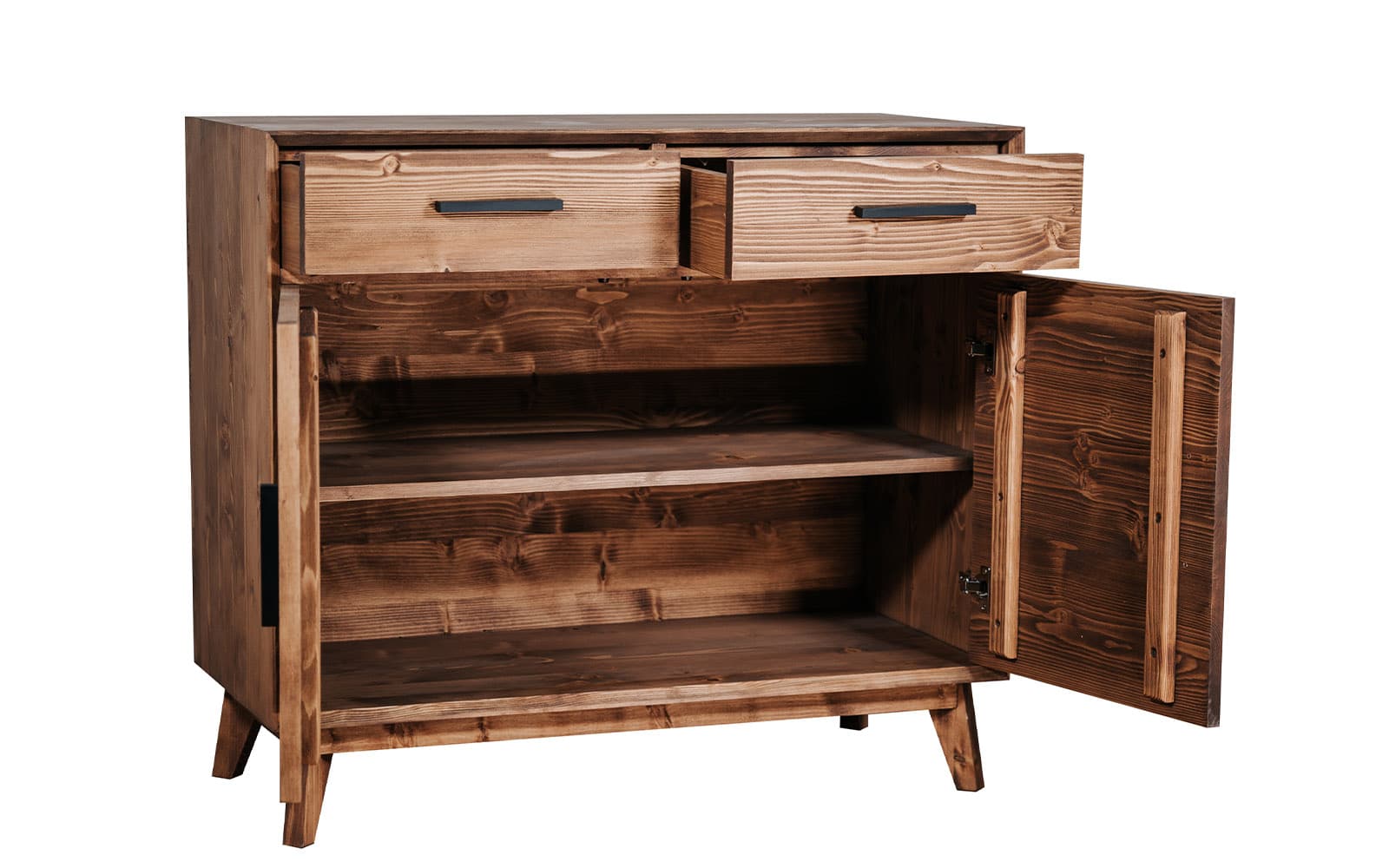 Bufetul Timeless cu două corpuri, două sertare și patru uși este o piesă de mobilier care îmbină perfect funcționalitatea cu estetica, fiind realizat integral din lemn masiv și finisat într-o nuanță caldă de whisky, ce scoate în evidență frumusețea naturală a fibrei lemnului. Această construcție solidă și durabilă oferă atât spațiu de depozitare amplu, cât și un design rafinat, capabil să completeze armonios orice încăpere.