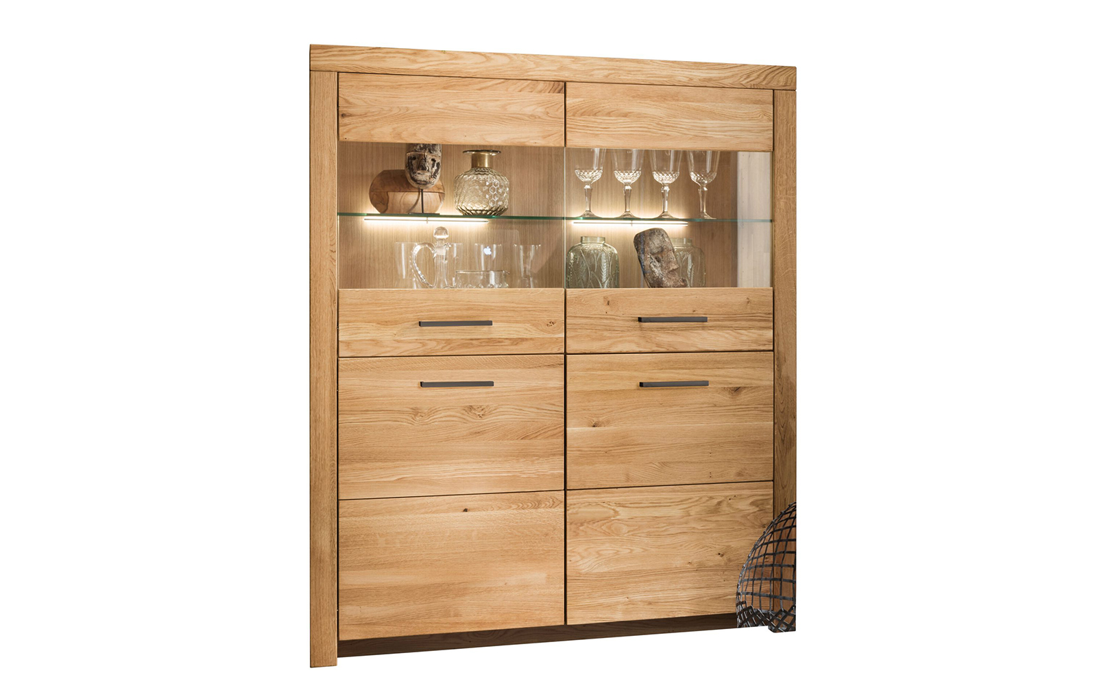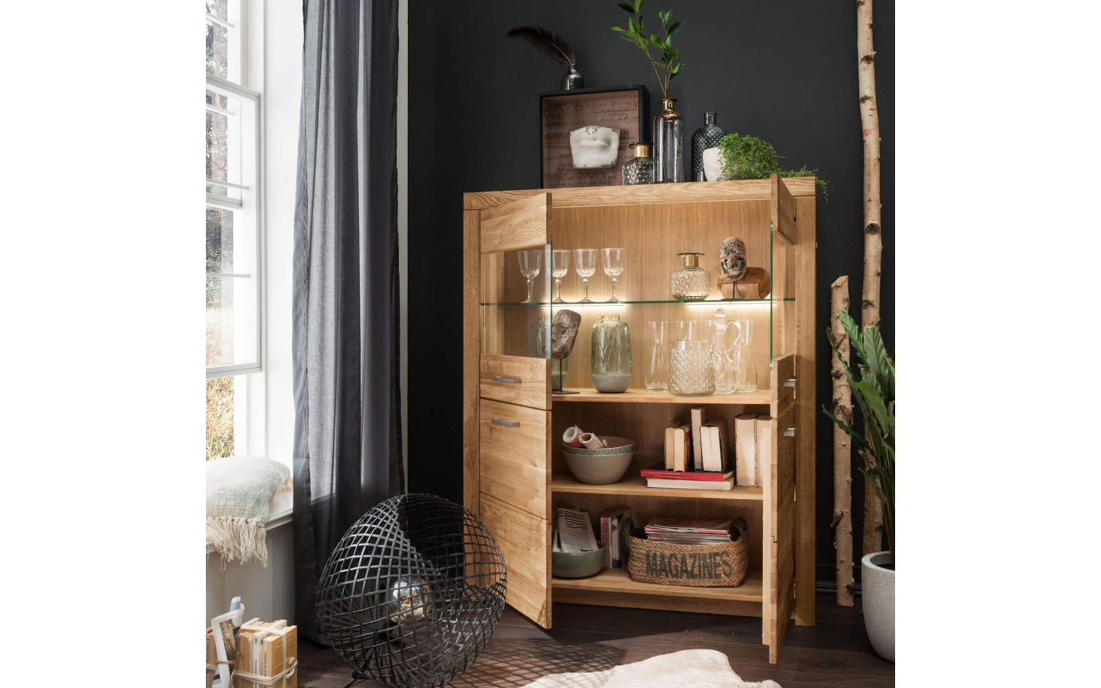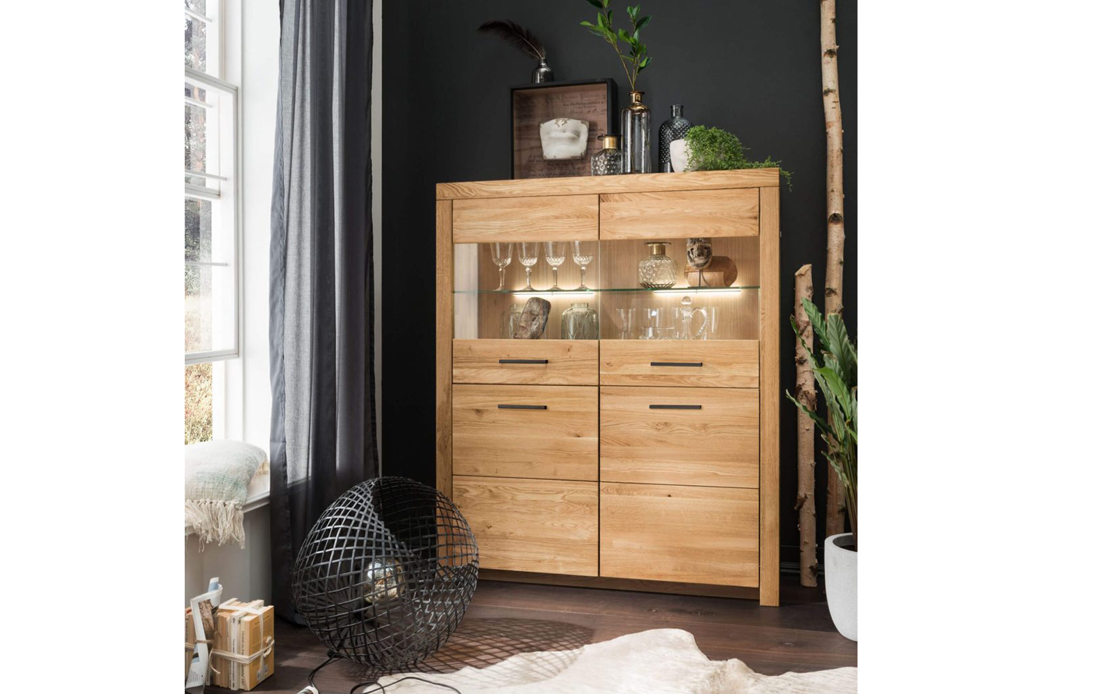 Proiectat pentru a răspunde atât cerințelor estetice, cât și celor funcționale, acest bufet dispune de dulapuri spațioase pentru depozitarea obiectelor de uz zilnic și de compartimente vitrate, ideale pentru expunerea seturilor de pahare, a porțelanului fin sau a altor obiecte decorative. Această combinație armonioasă între spațiile închise și cele transparente oferă un echilibru vizual plăcut și sporește versatilitatea piesei.