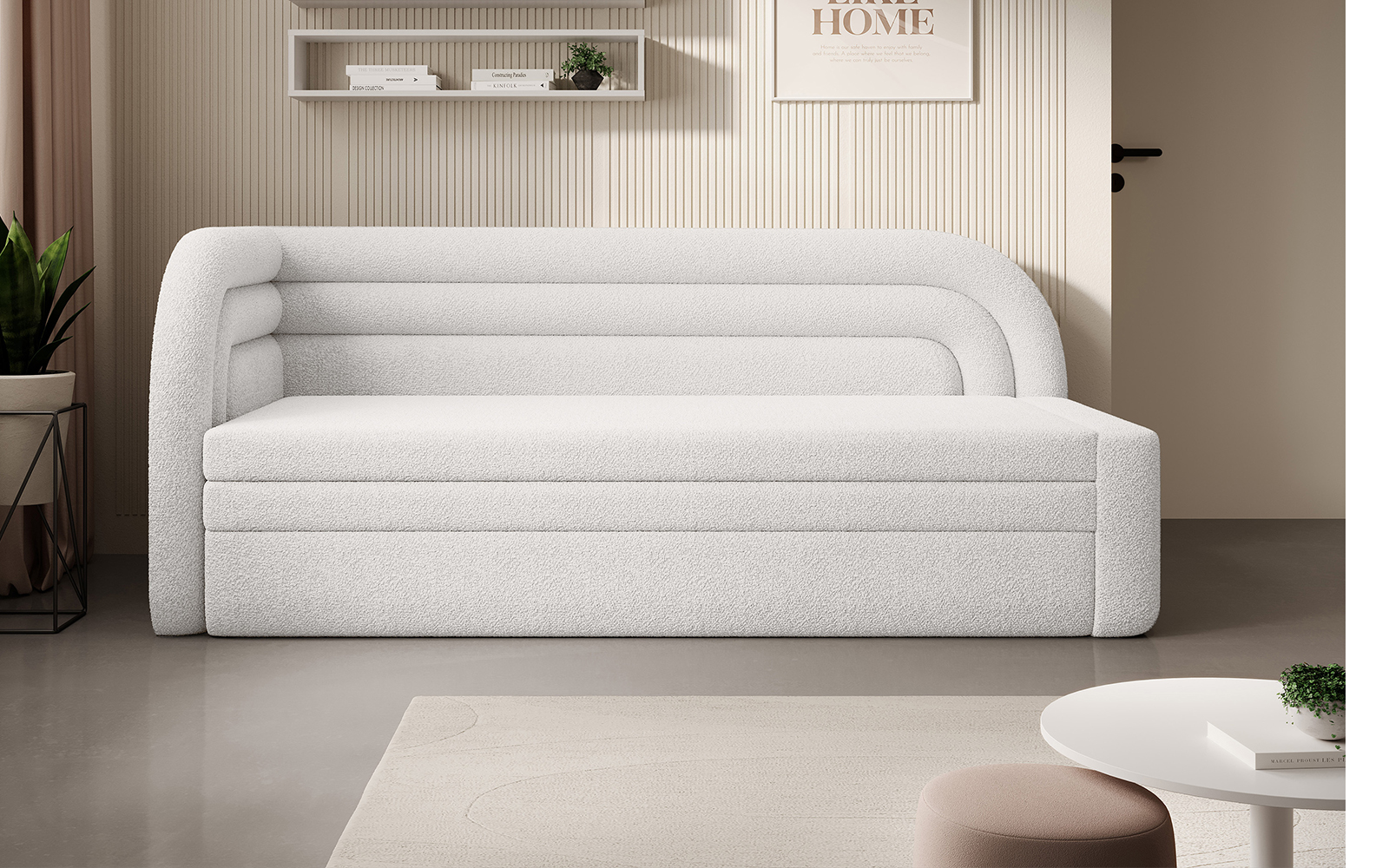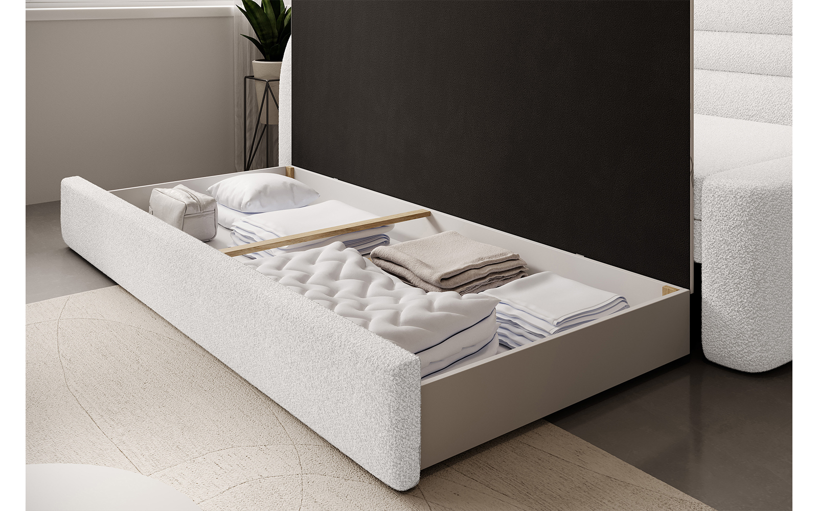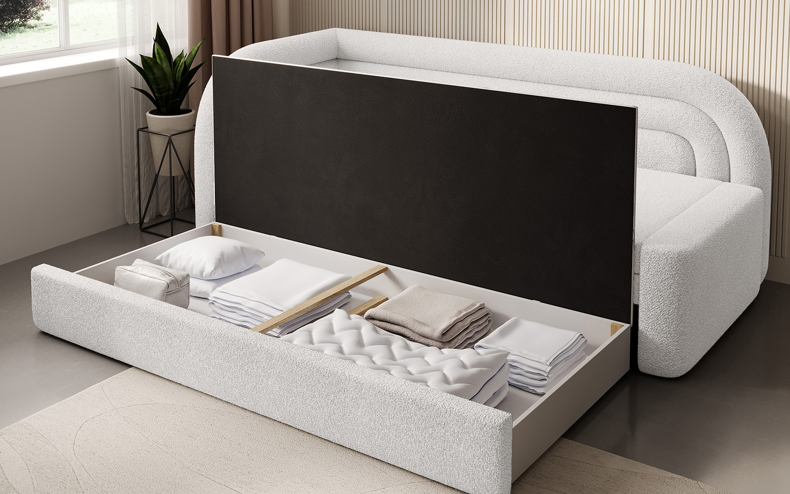 Canapeaua Filo dispune și de soluții practice care îți ușurează viața de zi cu zi. Include un compartiment spațios pentru depozitarea lenjeriei de pat, permițând organizarea rapidă și ușoară a textilelor. Mecanismul de pliere este ușor de utilizat, facilitând transformarea rapidă a canapelei într-un pat pentru oaspeți sau pentru utilizare zilnică.