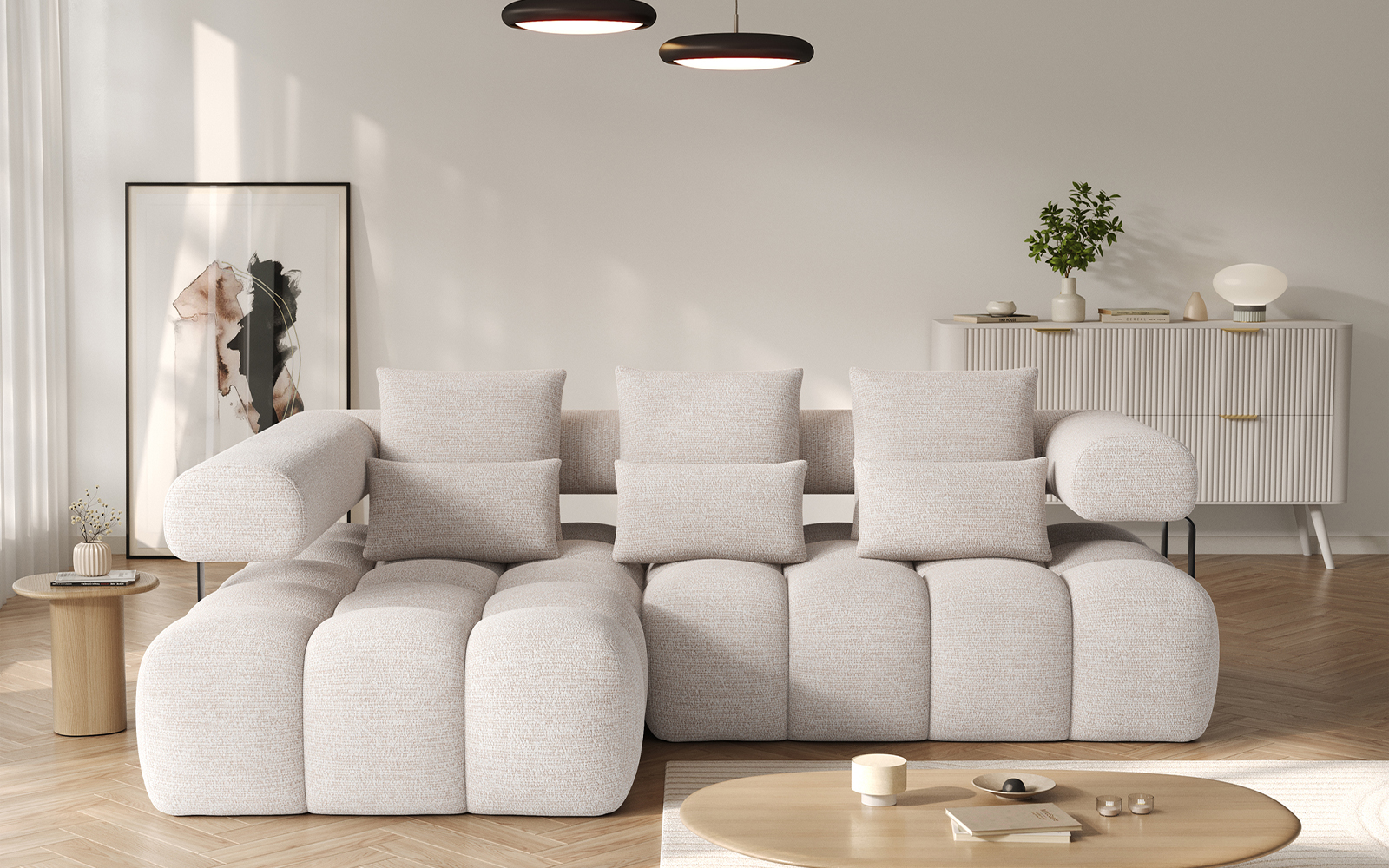 Colțarul Levvi reprezintă o combinație impecabilă între design modern, confort superior și funcționalitate inteligentă, fiind conceput pentru a transforma orice living într-un spațiu elegant, primitor și practic. Cu o formă tip L, proporții echilibrate și o tapițerie plăcută la atingere, Levvi este o piesă de mobilier statement, care atrage atenția prin estetica sa curată și formele rotunjite, dar care oferă în același timp un confort remarcabil pentru utilizarea zilnică.