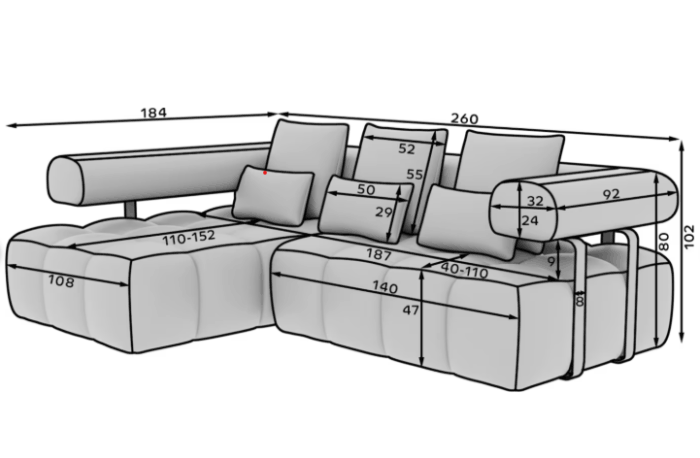 Dimensiuni colțar: 260 × 184 × 102 cm (L × l × H)