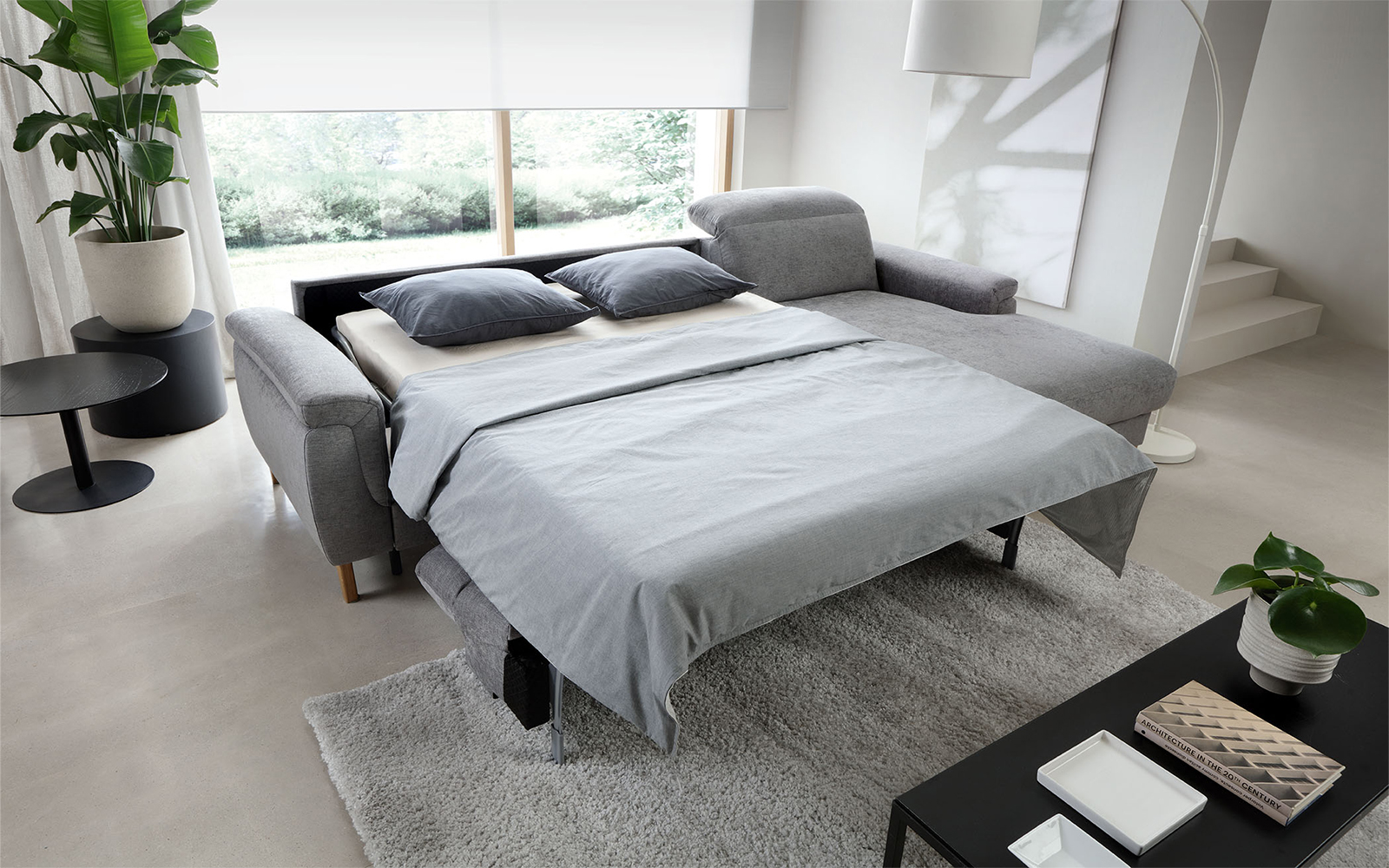 Mecanismul de transformare în pat este unul italian, ușor de folosit, iar dimensiunea saltelei (140×200 cm) asigură un nivel ridicat de confort pentru oaspeți sau pentru utilizare zilnică, fără a compromite aspectul sau funcționalitatea canapelei. Salteaua este perfect integrată în șezut, cu o grosime optimă pentru somn odihnitor, oferind susținere egală și stabilă pe întreaga suprafață.