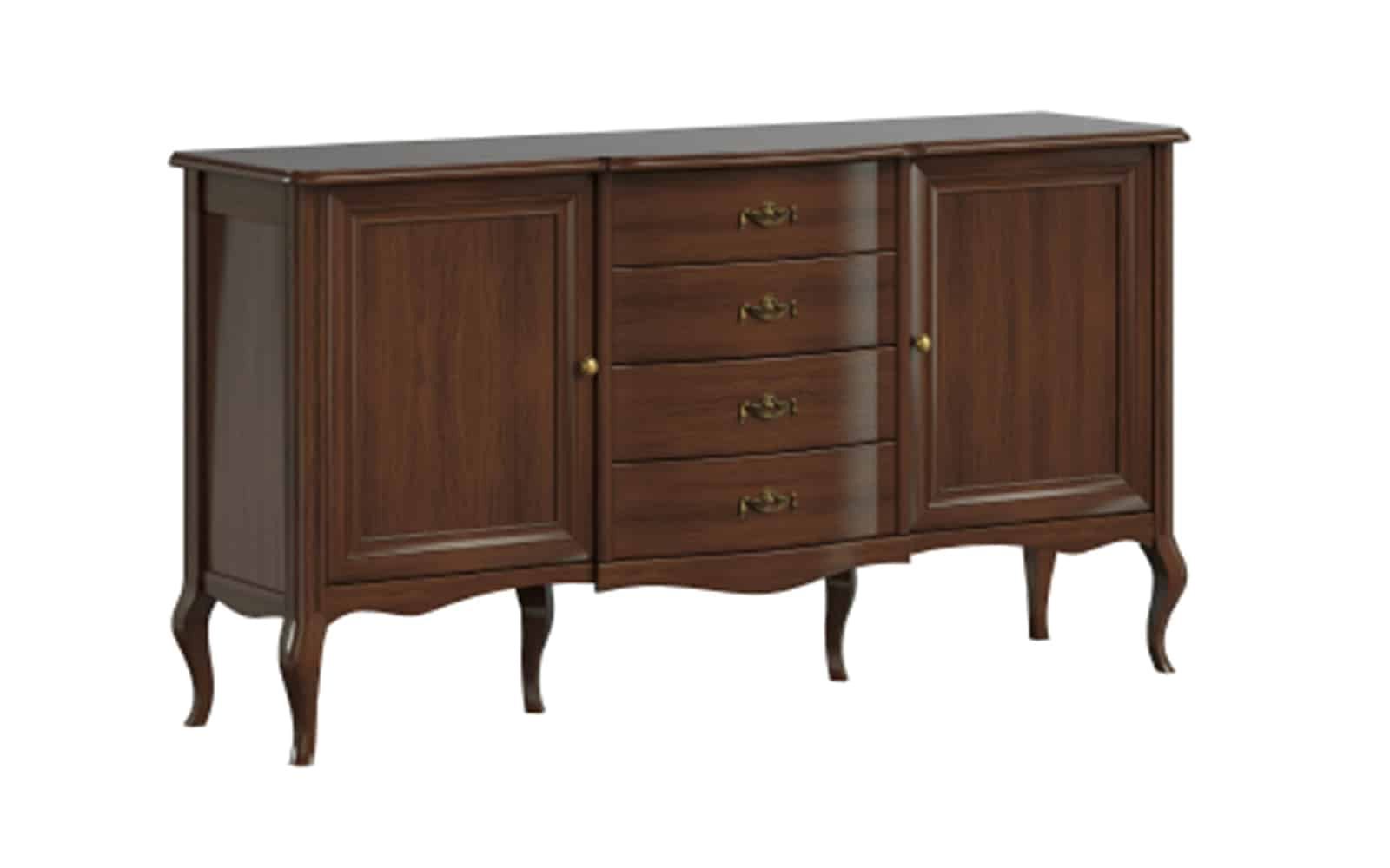 Designul comodei este atent gândit, cu picioarele ușor curbate și sculptate, care adaugă un aer de noblețe și rafinament, transformând-o într-un punct focal vizual. Formele clasice sunt îmbinate cu detalii contemporane, rezultând un echilibru perfect între stil și practicitate. Partea centrală a comodei este ocupată de patru sertare verticale, fiecare echipat cu mânere metalice elegante, finisate cu atenție, care facilitează accesul rapid și ușor la obiecte, oferind în același timp un contrast subtil și rafinat cu nuanța lemnului. Sertarele sunt suficient de încăpătoare pentru a depozita obiecte personale, accesorii sau documente, menținând ordinea și organizarea spațiului.