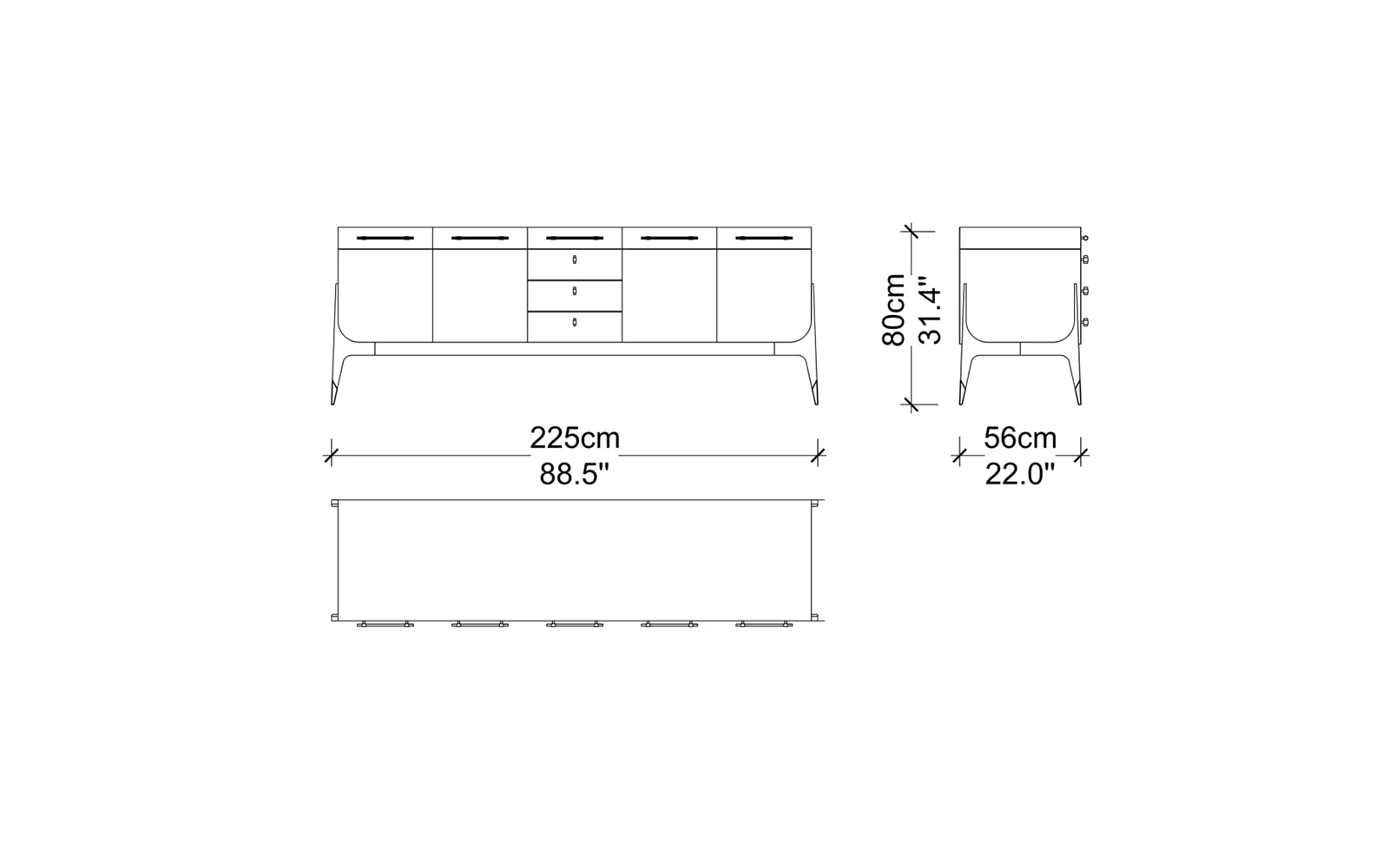 Compartimentarea interioară este gândită pentru funcționalitate maximă, combinând spații generoase de depozitare cu sertare centrale ideale pentru organizarea tacâmurilor, textilelor sau accesoriilor de dining și living. Lățimea de 225 cm permite utilizarea comodei atât ca piesă centrală într-o zonă de dining, cât și ca element decorativ și practic într-un living elegant sau hol amplu.