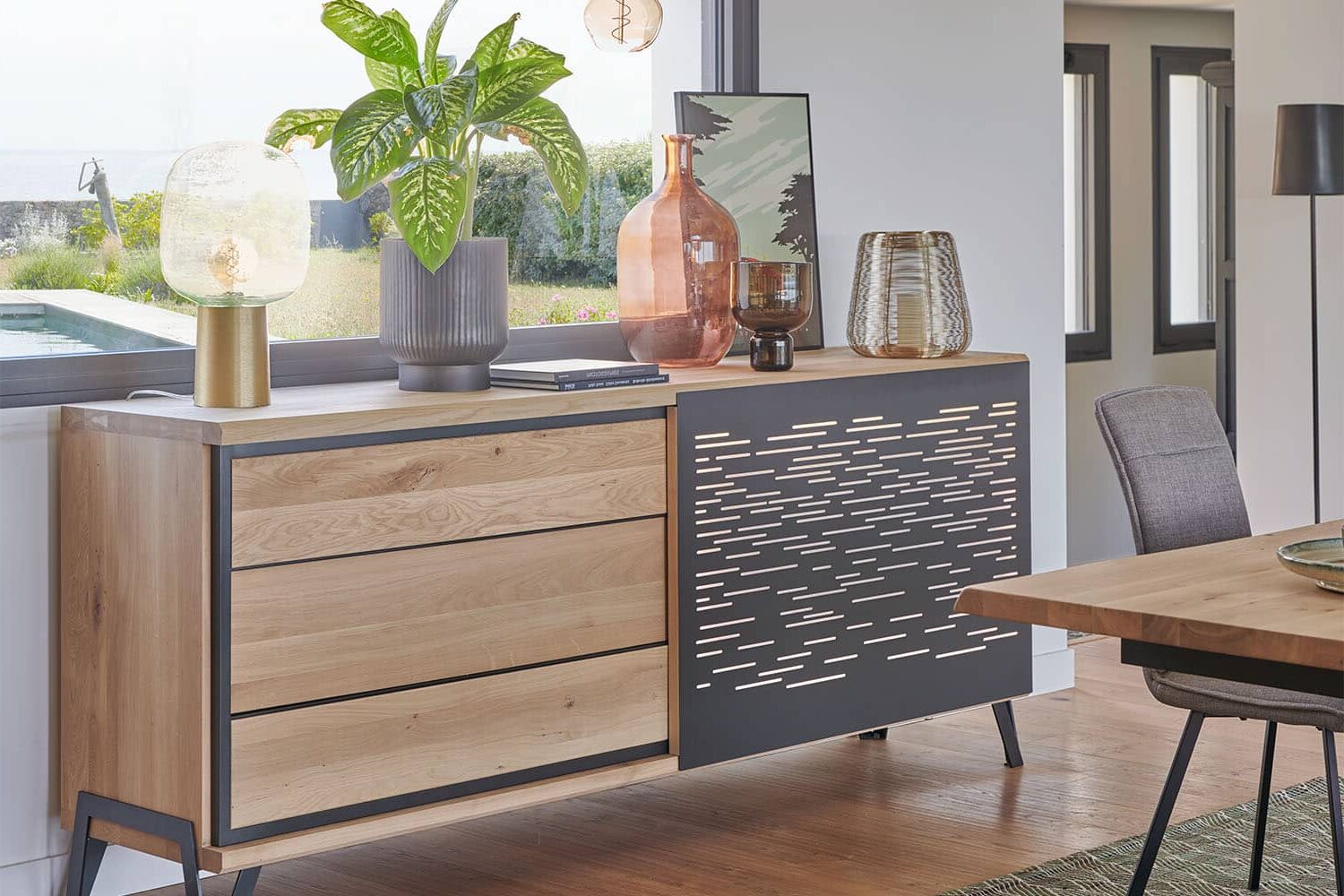 Designul său atent studiat îmbină liniile curate cu proporții echilibrate și accente grafice metalice, specific colecției Edge, conferind piesei o identitate vizuală puternică. Contrastul dintre lemnul cald și elementele metalice perforate creează un efect modern, aerisit și sofisticat, potrivit atât pentru interioare elegante, cât și pentru amenajări contemporane cu influențe industrial-chic.
