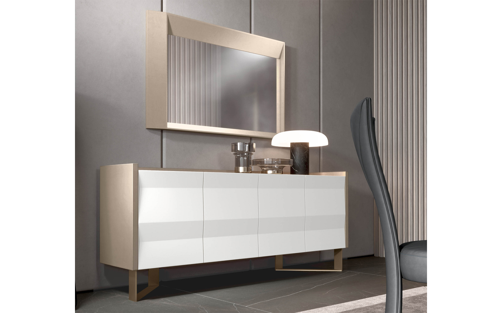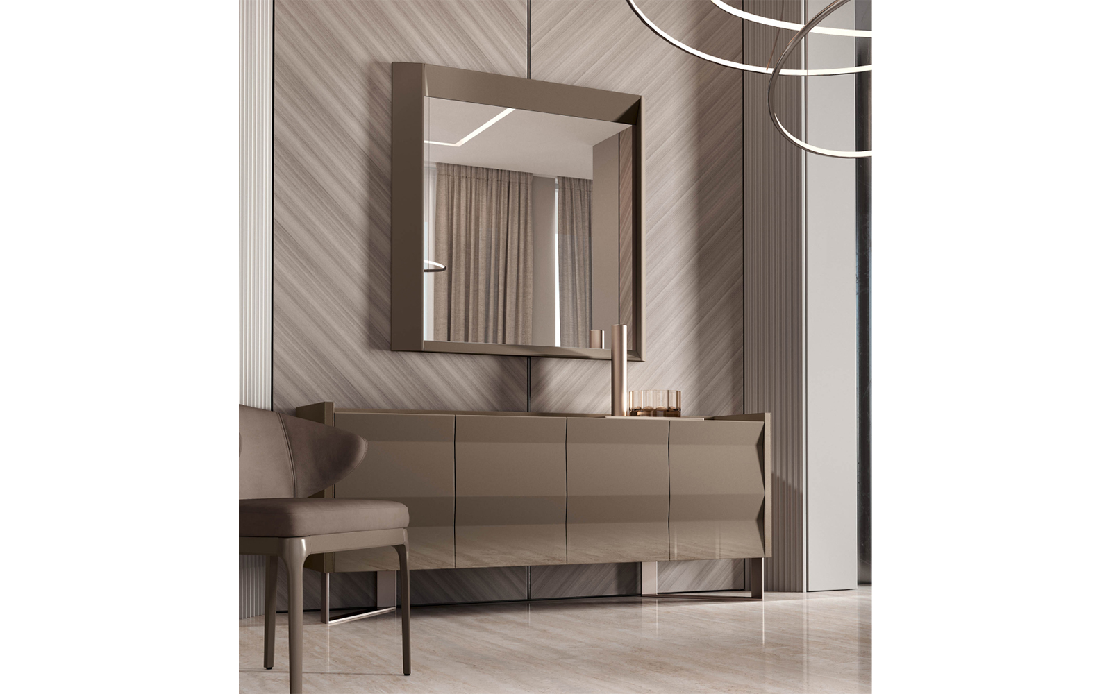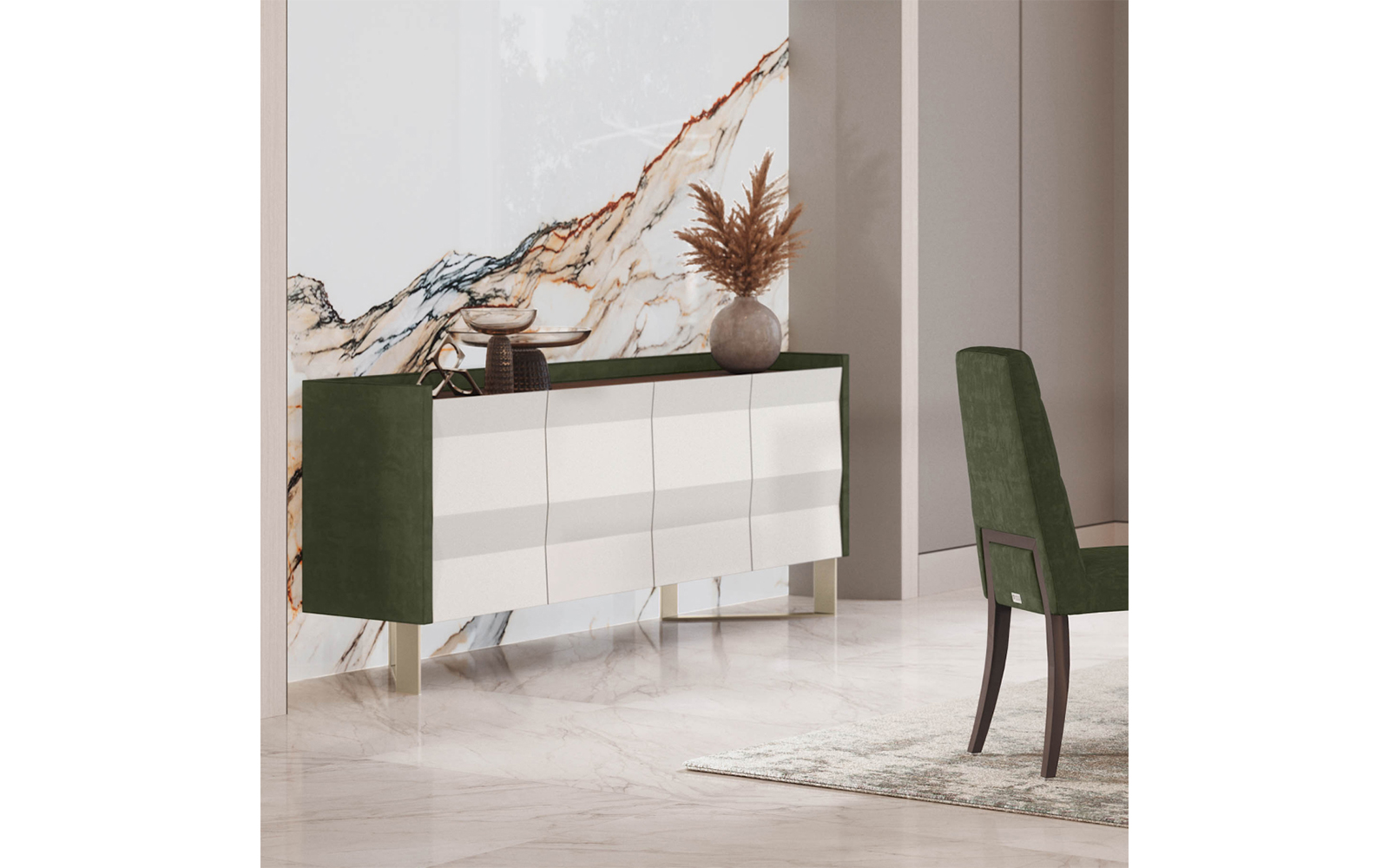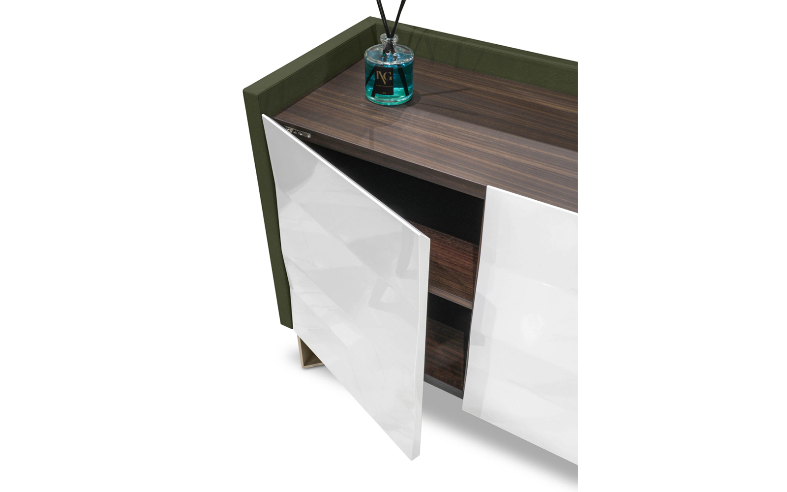 Sideboard-ul „Showcase” din colecția Futura reprezintă o piesă de mobilier statement, ideală pentru zona de living sau dining sofisticată. Fronturile sunt realizate din panouri fațetate, finisate în lac lucios pentru a crea un efect vizual dinamic și elegant, captând lumina și adăugând profunzime. Lateralele sunt îmbrăcate în piele de înaltă calitate, cusută cu precizie pentru a contura subtil geometria corpului, oferind în același timp o senzație de rafinament tactil.