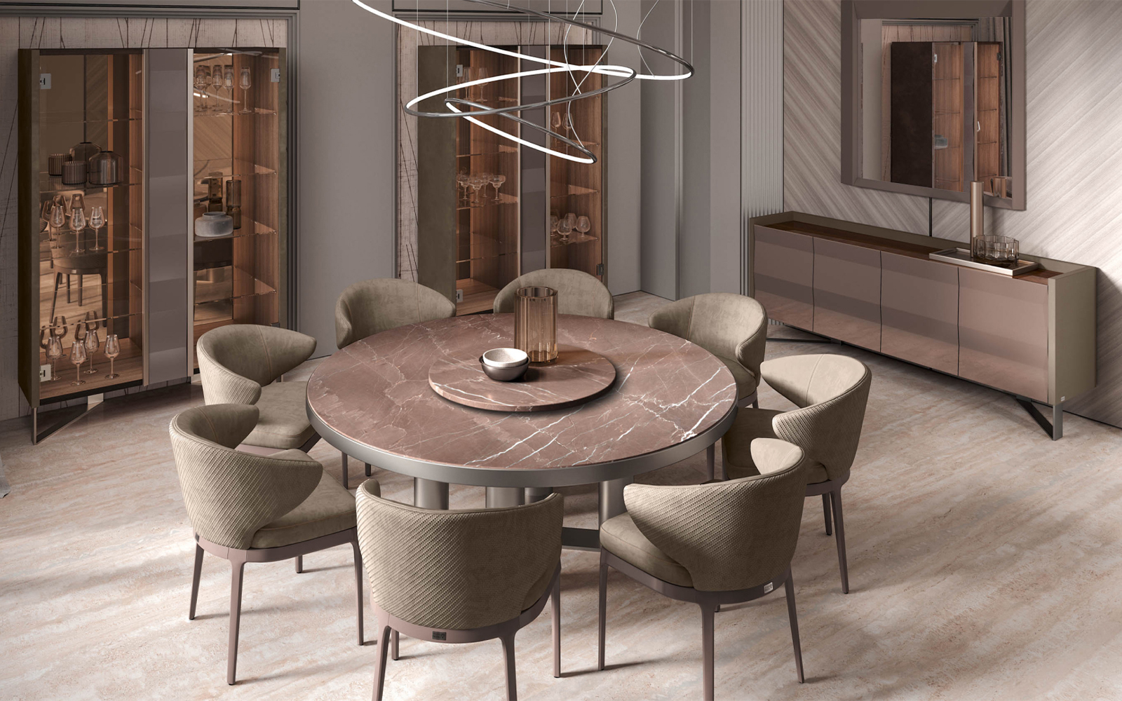 „Showcase” poate fi personalizată atât în ceea ce privește finisajul exterior (piele, lemn furniruit sau lac), cât și baza metalică, oferind posibilitatea integrării armonioase într-o gamă variată de stiluri premium, de la modern elegant până la contemporan sofisticat. Dimensiunile sale (L 200 × P 46 × H 86 cm) o fac ideală pentru spații ample, fiind perfectă pentru expunerea obiectelor decorative, dar și pentru depozitare practică.
