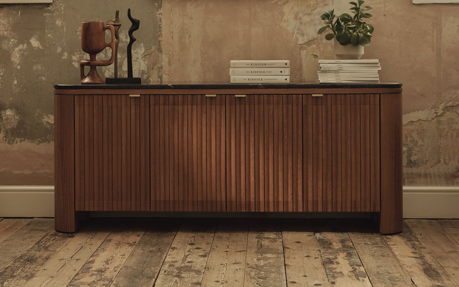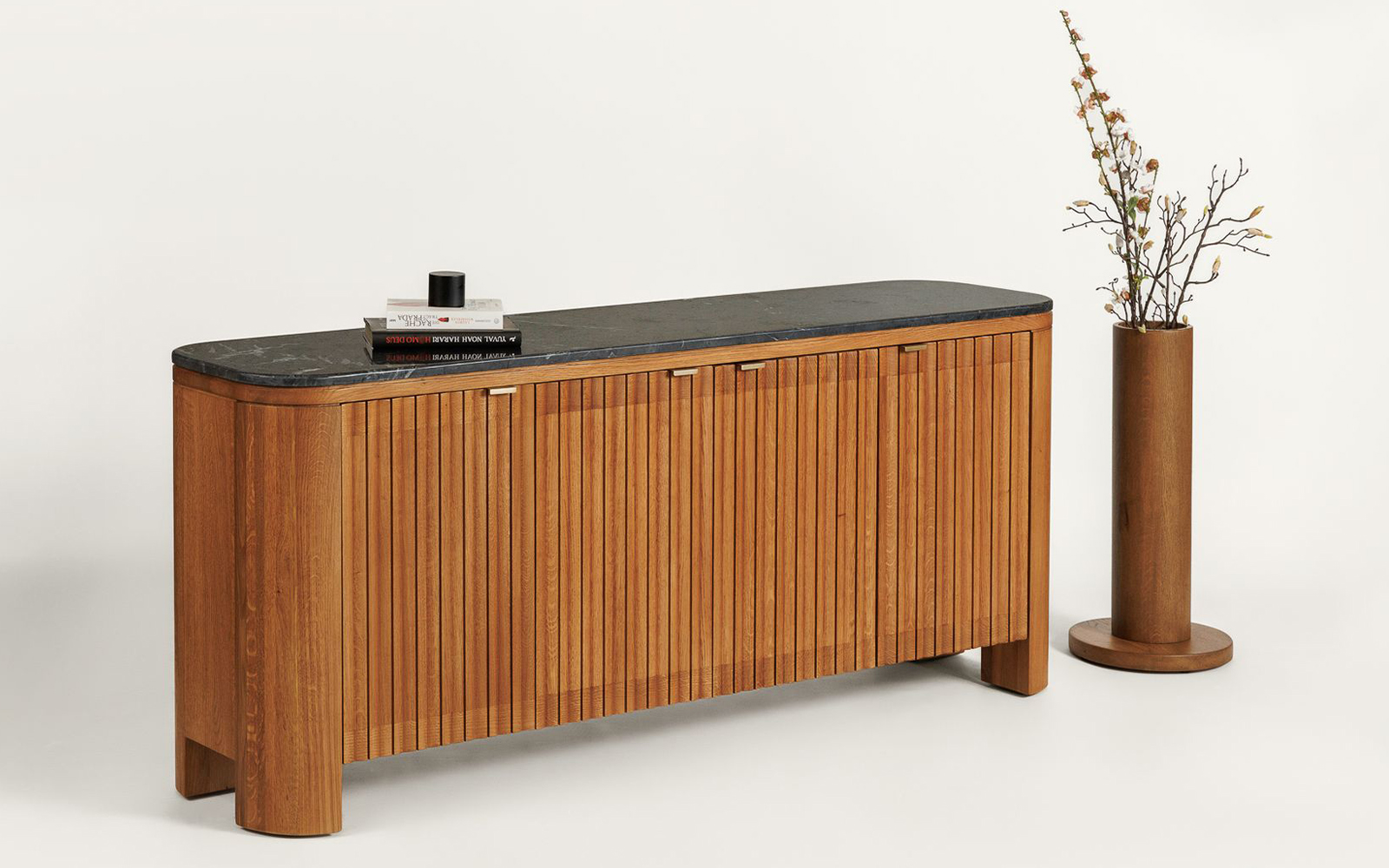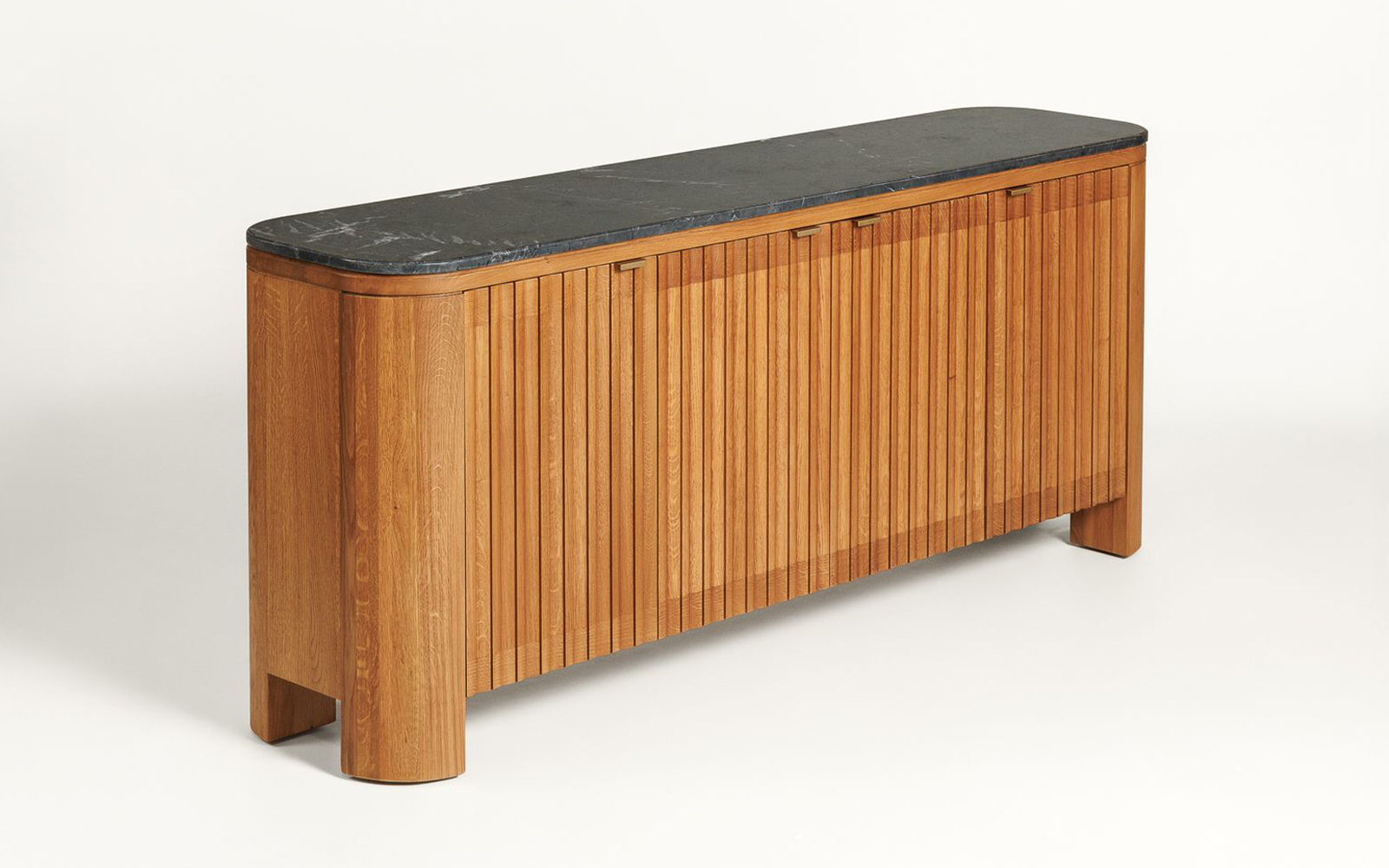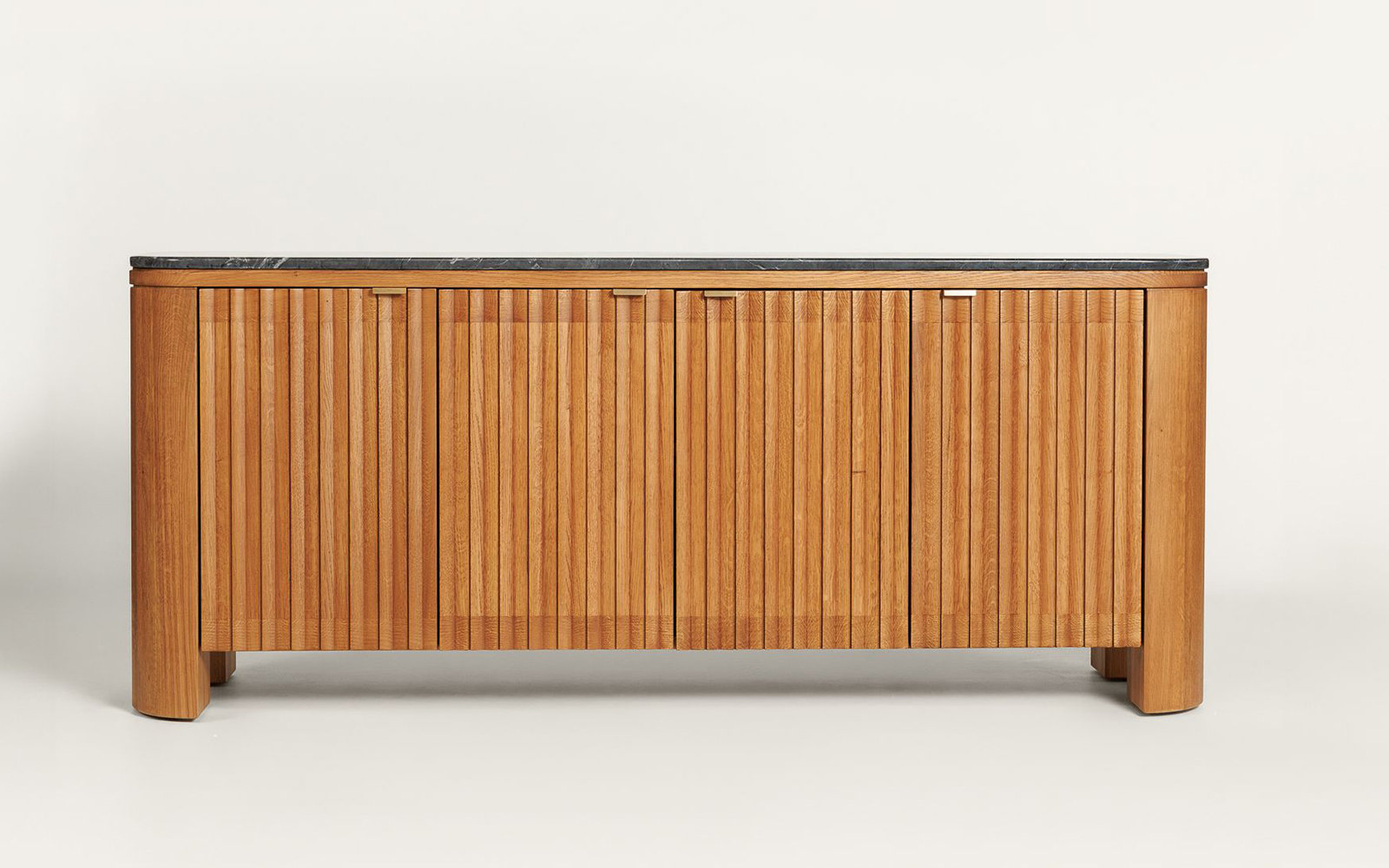 Designul său este definit de fronturile verticale fin sculptate, care creează un ritm vizual subtil, jucându-se cu lumina și umbrele pentru a da volum și profunzime. Muchiile rotunjite aduc o notă de delicatețe și rafinament, făcând trecerea între structura solidă din lemn și suprafața sofisticată din marmură aproape imperceptibilă. Fiecare detaliu este gândit pentru a transmite o estetică curată, contemporană, dar în același timp atemporală.