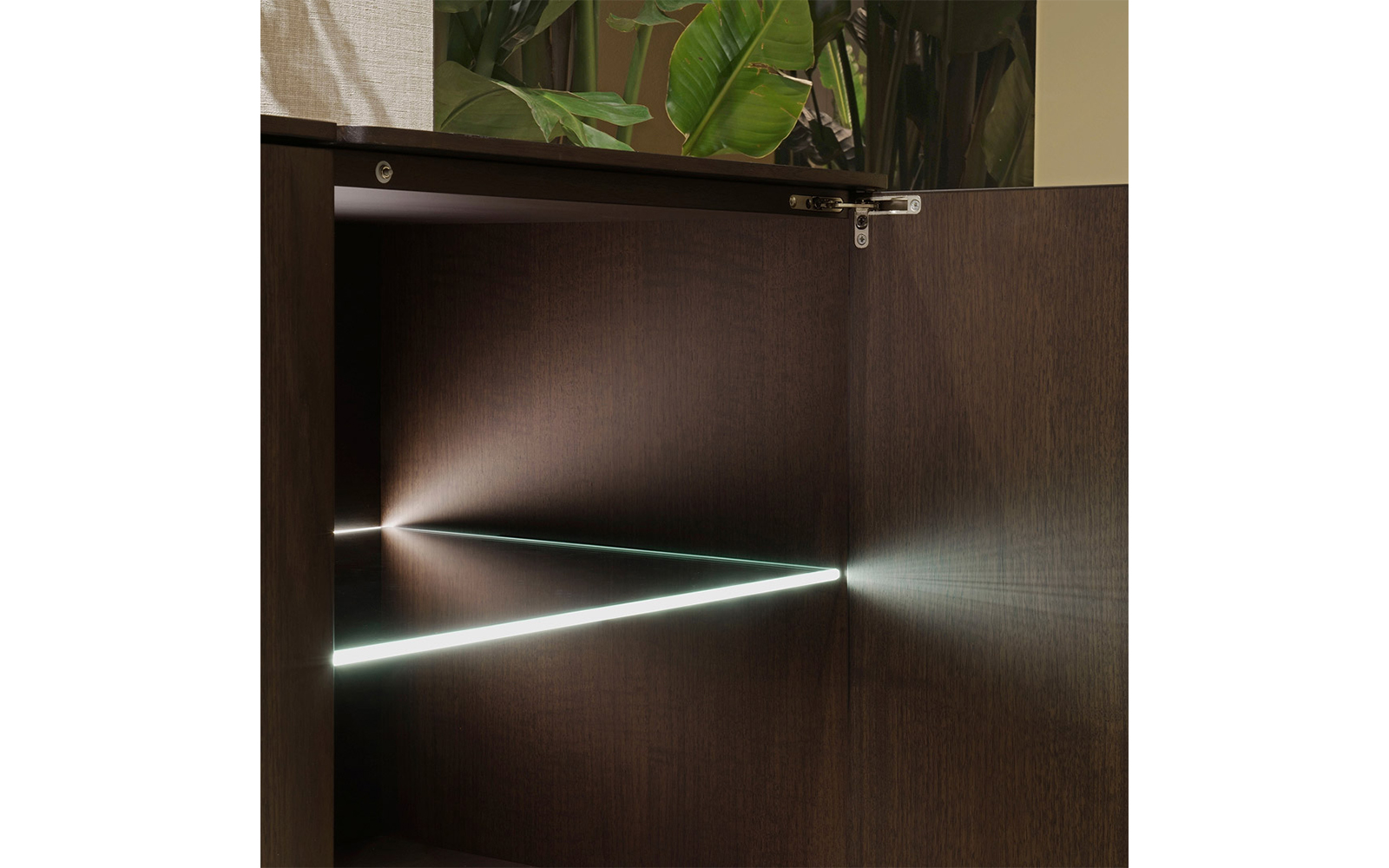 Interiorul include o poliță din sticlă extra-clară, oferind un grad ridicat de transparență și eleganță, ideală pentru prezentarea discretă a obiectelor. Comoda este prevăzută cu iluminare LED cu lumină caldă, ce evidențiază finețea materialelor și creează o atmosferă ambientală plăcută, perfectă pentru zone lounge, livinguri spațioase sau amenajări de tip home cinema.