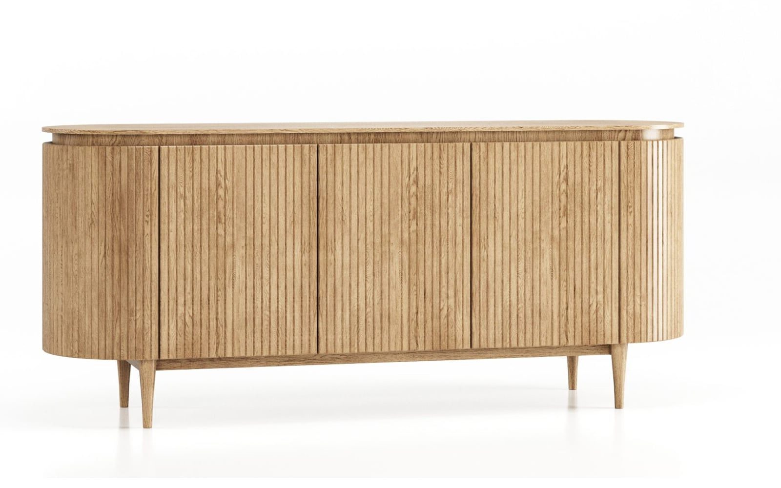 Comoda Miami cu 5 uși este expresia perfectă a echilibrului între estetică și funcționalitate, oferind un mobilier de înaltă calitate realizat exclusiv din lemn masiv de stejar. Cu o siluetă impunătoare și detalii rafinate, această piesă impresionează prin designul său modern, dar cald, conturat de texturile naturale ale lemnului și de liniile verticale canelate, care adaugă ritm și profunzime vizuală. Elementele curbate de pe laturi rotunjesc forma, conferindu-i o alură sofisticată și fluidă, potrivită unui ambient elegant.