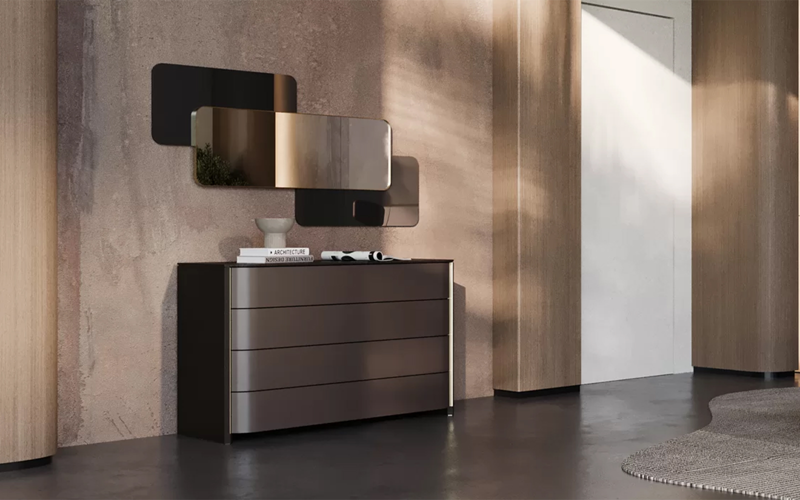 • Comodă cu design contemporan, caracterizată prin linii fluide și proporții armonioase