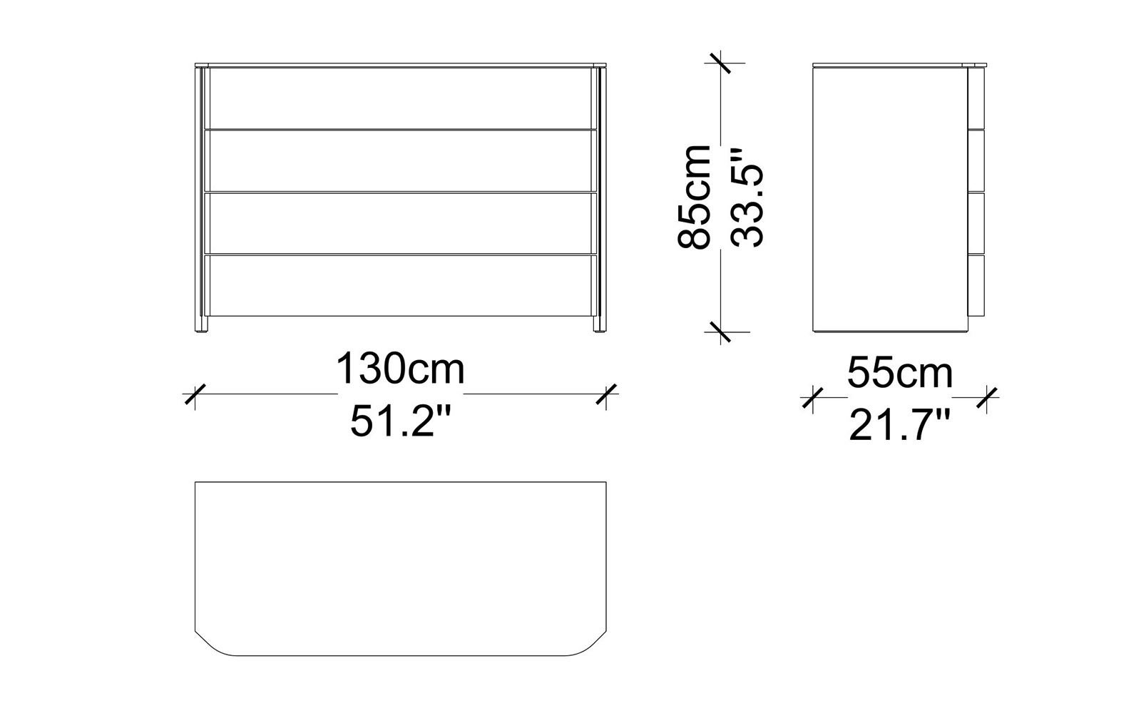 Dimensiunile atent gândite – lățime de 130 cm, adâncime de 55 cm și înălțime de 85 cm – oferă un echilibru ideal între capacitatea de depozitare și economia de spațiu, permițând amplasarea comodă atât în camere generoase, cât și în dormitoare de dimensiuni medii. Volumul interior este organizat prin patru sertare spațioase, concepute pentru a acomoda articole vestimentare, textile, lenjerii sau obiecte personale, contribuind la menținerea unui ambient ordonat și aerisit.