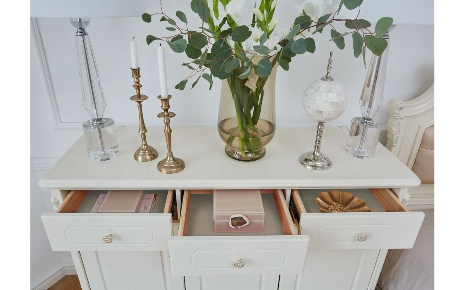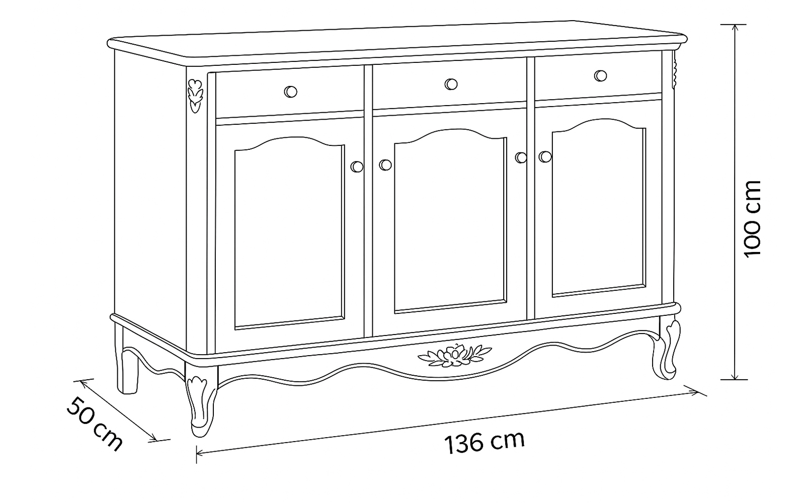 Designul este evidențiat de fronturile frezate decorativ și de cornișa elegantă, care adaugă profunzime și caracter piesei. Elementele ornamentale inspirate din motive florale, discret integrate în structură, completează estetica romantică specifică stilului francez, transformând comoda într-o piesă cu personalitate.