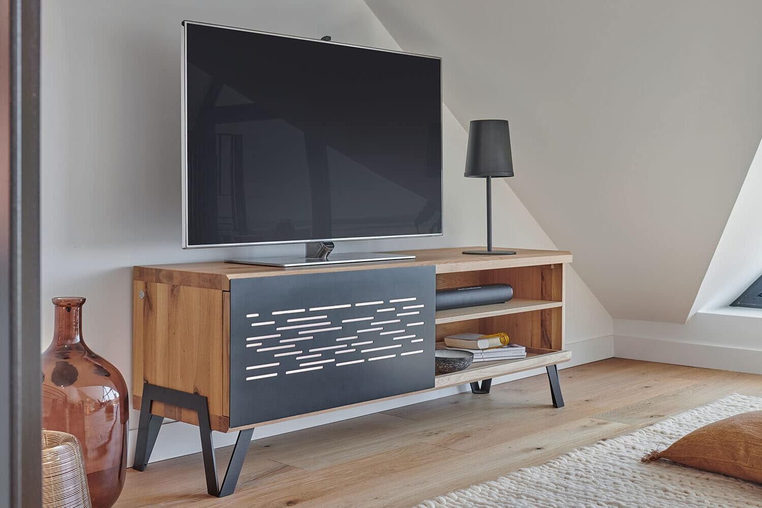 Designul este definit de frontul metalic cu perforații decorative, element caracteristic colecției Edge, care adaugă un accent modern-industrial și creează un contrast plăcut cu lemnul. Compartimentarea este gândită inteligent pentru a răspunde nevoilor actuale de depozitare: spațiile deschise sunt ideale pentru console, media box, routere sau accesorii, în timp ce zonele închise păstrează ordinea și ascund cablurile și obiectele pe care nu dorești să le expui.
