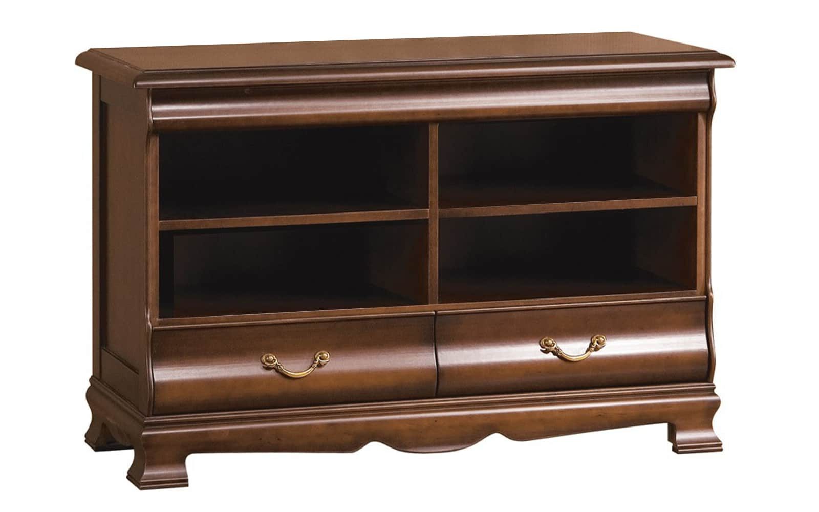 Configurația sa inteligentă include două sertare spațioase, dotate cu sistem de închidere amortizată, perfecte pentru depozitarea discretă a obiectelor, și trei nișe deschise, ideale pentru echipamente audio-video, console de jocuri sau alte dispozitive necesare. Designul clasic, completat de mânere metalice elegante și detalii decorative subtile, conferă un aspect sofisticat care se potrivește atât în interioare tradiționale, cât și în cele cu accente vintage.
