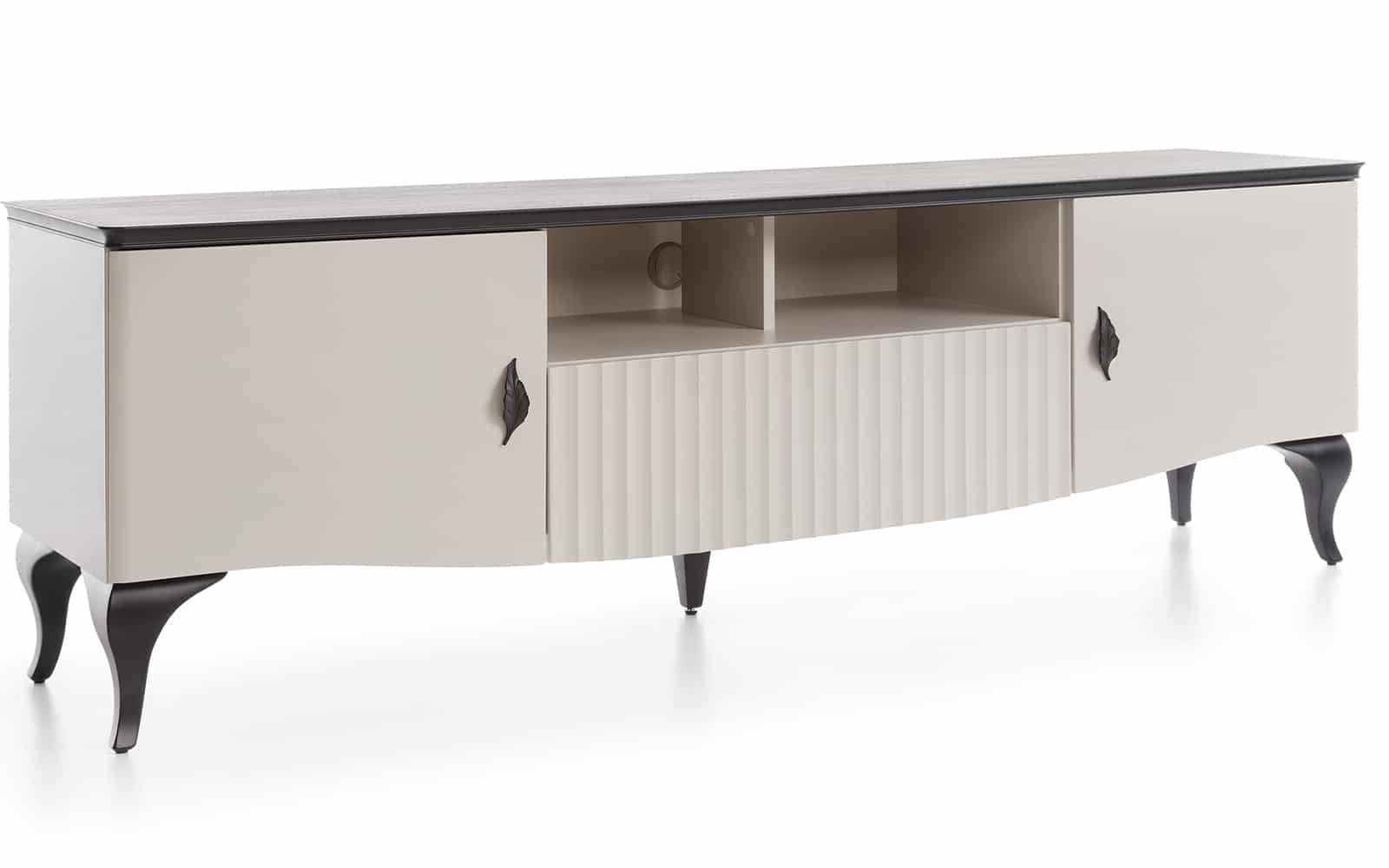 Comoda dispune de două uși laterale și un compartiment central deschis, perfect pentru echipamente media precum console de jocuri, DVD playere sau receivere TV. Compartimentul central include un orificiu pentru cabluri, facilitând gestionarea eficientă a acestora și menținerea unui aspect ordonat. Ușile laterale sunt dotate cu mânere sculptate sub forma unor frunze, adăugând un element distinctiv și artistic piesei de mobilier. Aceste mânere nu sunt doar estetice, ci și funcționale, permițând o deschidere și închidere ușoară a ușilor.