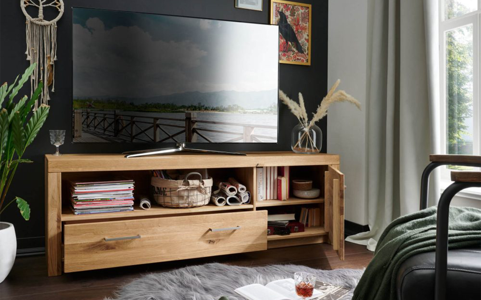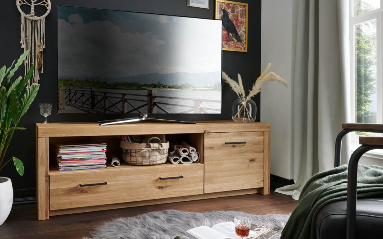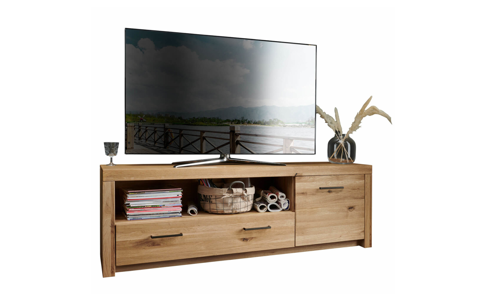 Construcția solidă și proporțiile sale elegante fac din această comodă o alegere ideală pentru zona de living. Organizarea interioară este atent gândită: un sertar spațios pentru accesorii, cabluri sau telecomenzi, un dulap închis pentru obiecte ce necesită discreție și un raft deschis, special conceput pentru echipamente multimedia, precum playere, console sau receivere. Această combinație inteligentă de spații oferă atât practicitate în utilizare, cât și un aspect vizual ordonat și elegant.