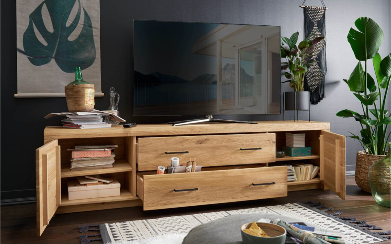 Comoda este proiectată pentru a răspunde tuturor cerințelor unui living modern: dispune de sertare încăpătoare pentru accesorii, telecomenzi sau documente, de dulapuri laterale spațioase pentru obiecte mai voluminoase și de o suprafață generoasă, perfect adaptată pentru susținerea unui televizor de mari dimensiuni. Organizarea inteligentă a compartimentelor asigură un aspect ordonat și elegant, transformând zona multimedia într-un colț sofisticat al casei.