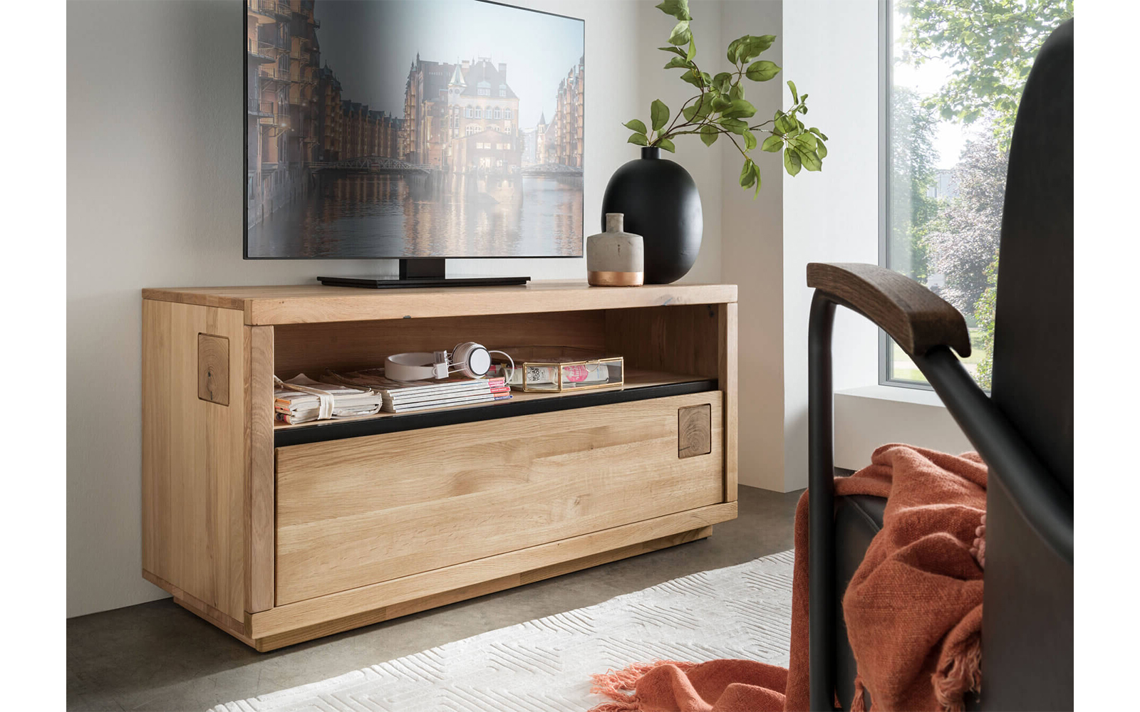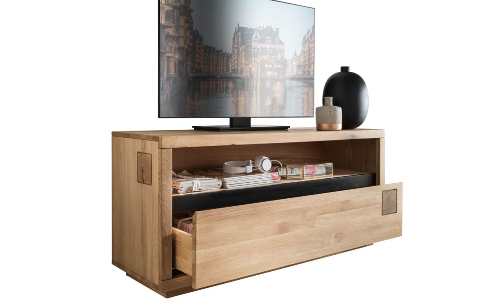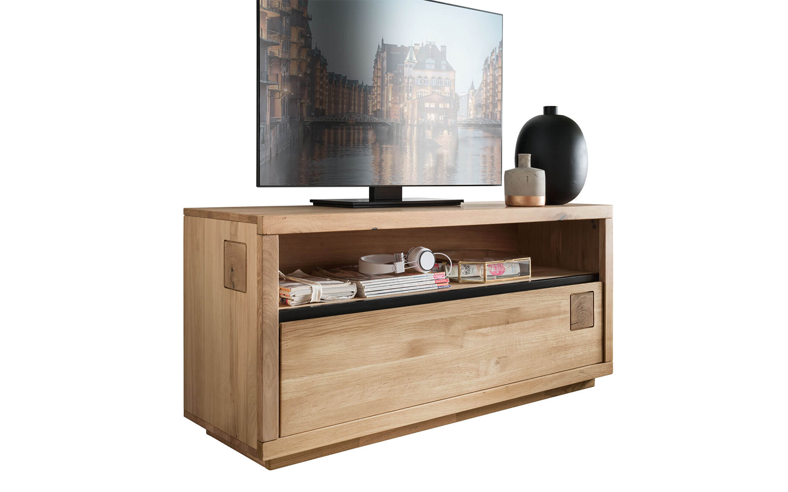 Comoda TV Urban Loft IV este soluția perfectă pentru cei care își doresc un suport TV compact, elegant și funcțional, care să se integreze cu ușurință chiar și în spațiile mai mici. Construită din stejar masiv de cea mai înaltă calitate, această piesă de mobilier reflectă autenticitatea lemnului natural, punând în valoare textura, nodurile și variațiile sale de culoare, fiecare exemplar fiind unic și irepetabil.