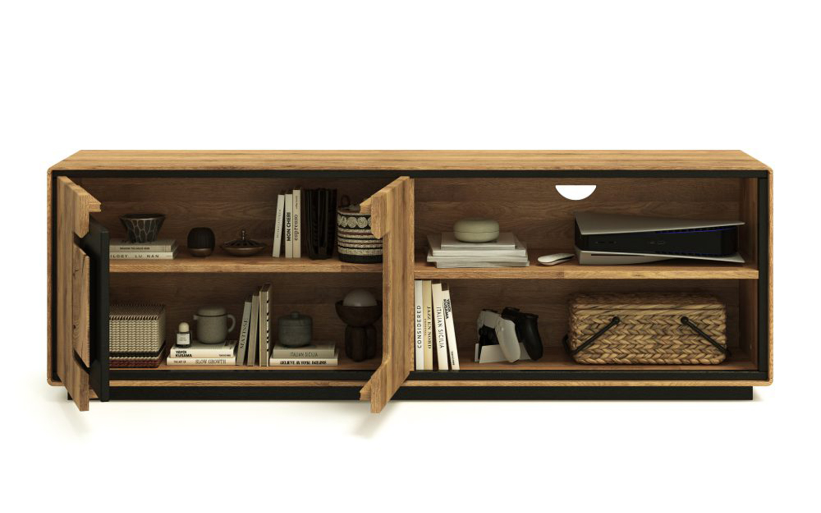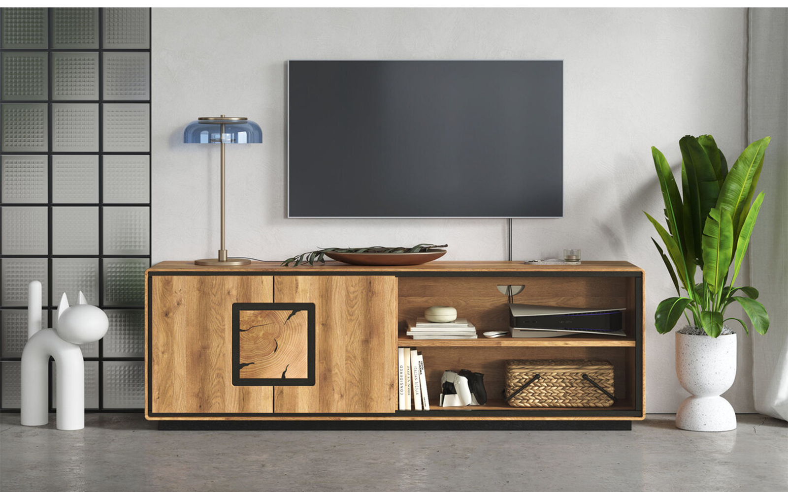 Concepută pentru a răspunde nevoilor actuale de confort și organizare, această comodă oferă o combinație echilibrată de spații de depozitare: compartimente închise pentru a păstra ordinea și discreția, sertare practice pentru obiectele mici și un raft deschis special conceput pentru echipamente audio-video sau alte accesorii multimedia. Această structură inteligentă permite integrarea tehnologiei în decor fără a afecta armonia vizuală a încăperii.