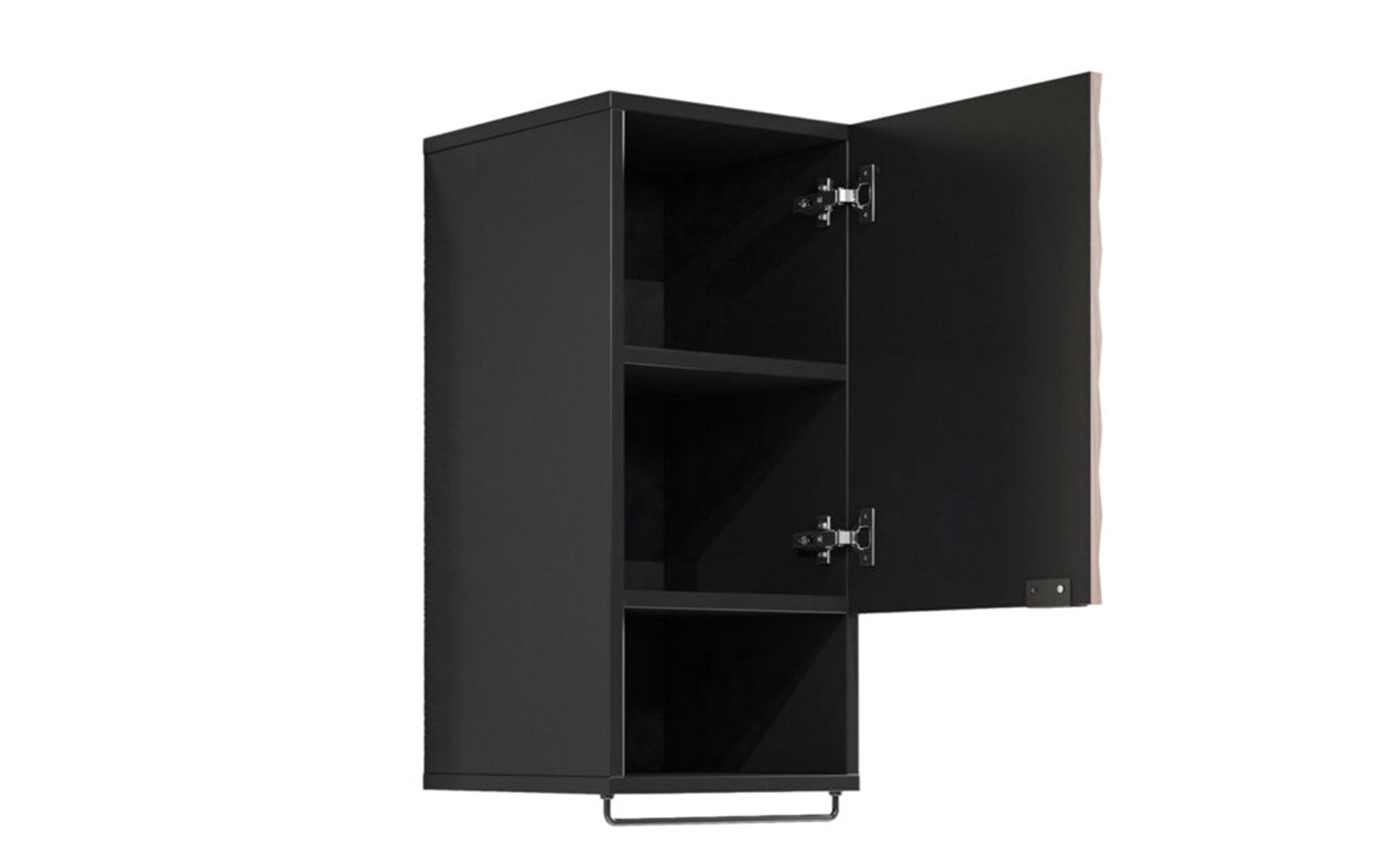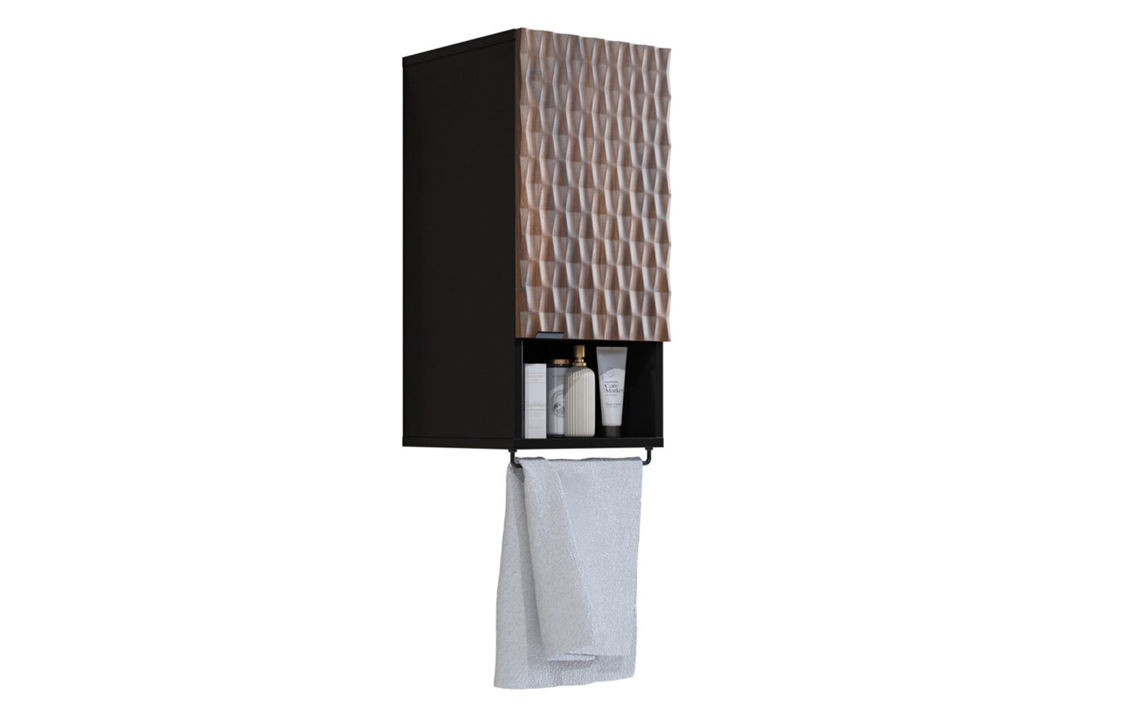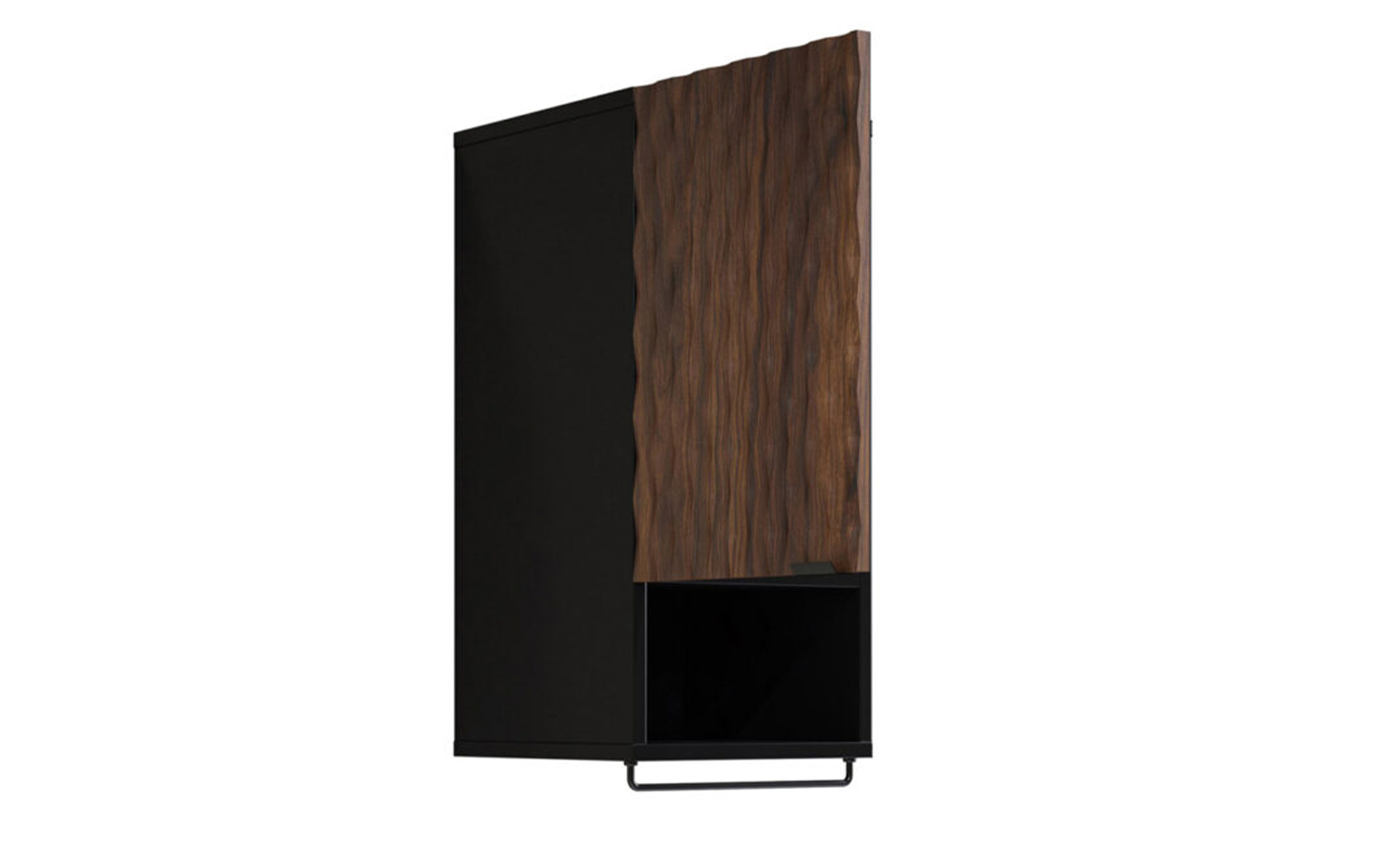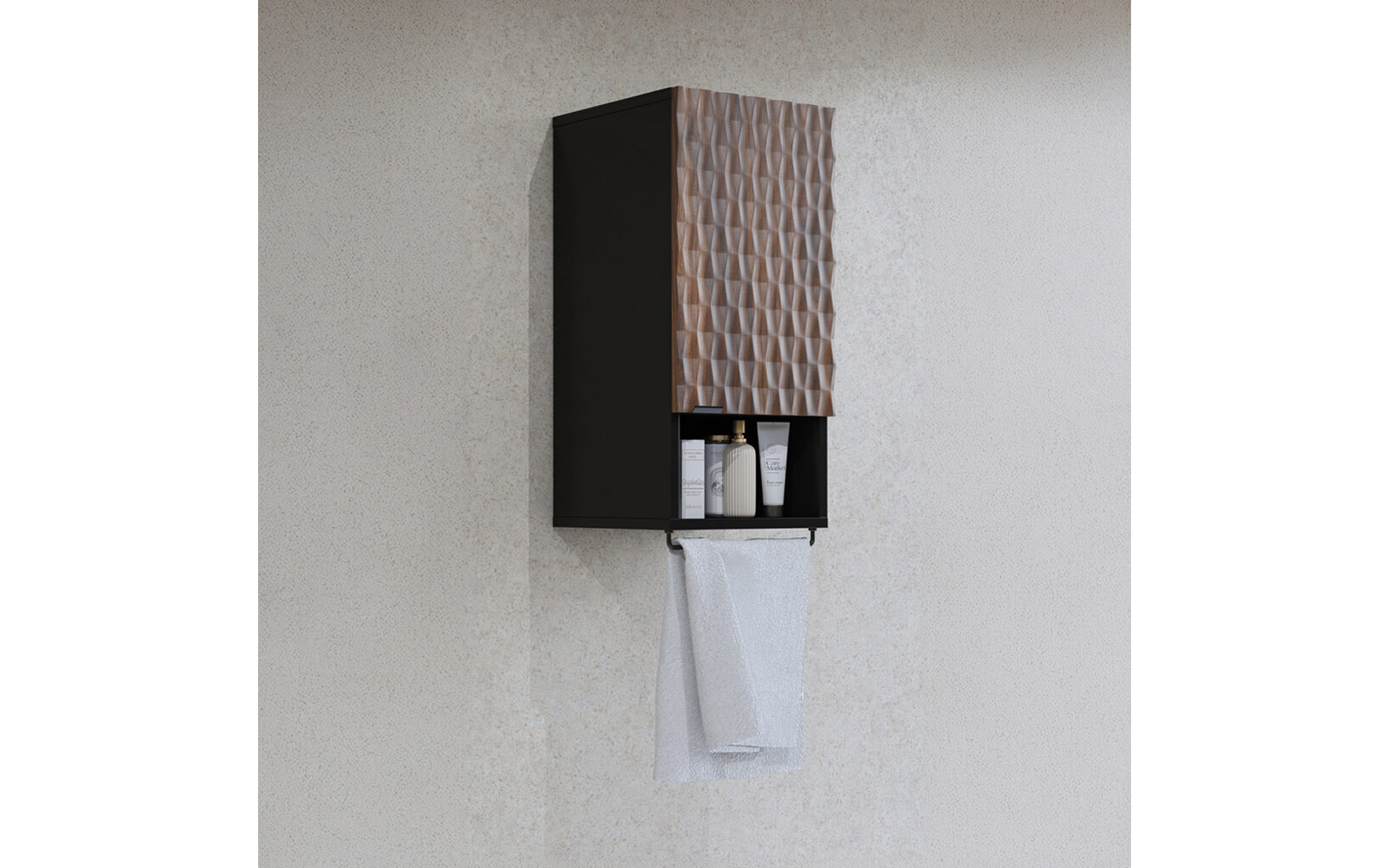 Dulapul suspendat Enzaro cu 1 ușă aduce un aer modern și elegant în orice baie. Cu finisaj texturat din MDF Catania, carcasă neagră și posibilitate de iluminare LED, această piesă reușește să combine perfect estetica de lux cu funcționalitatea practică. Alegerea ideală pentru cei care doresc o baie rafinată, bine organizată și contemporană.