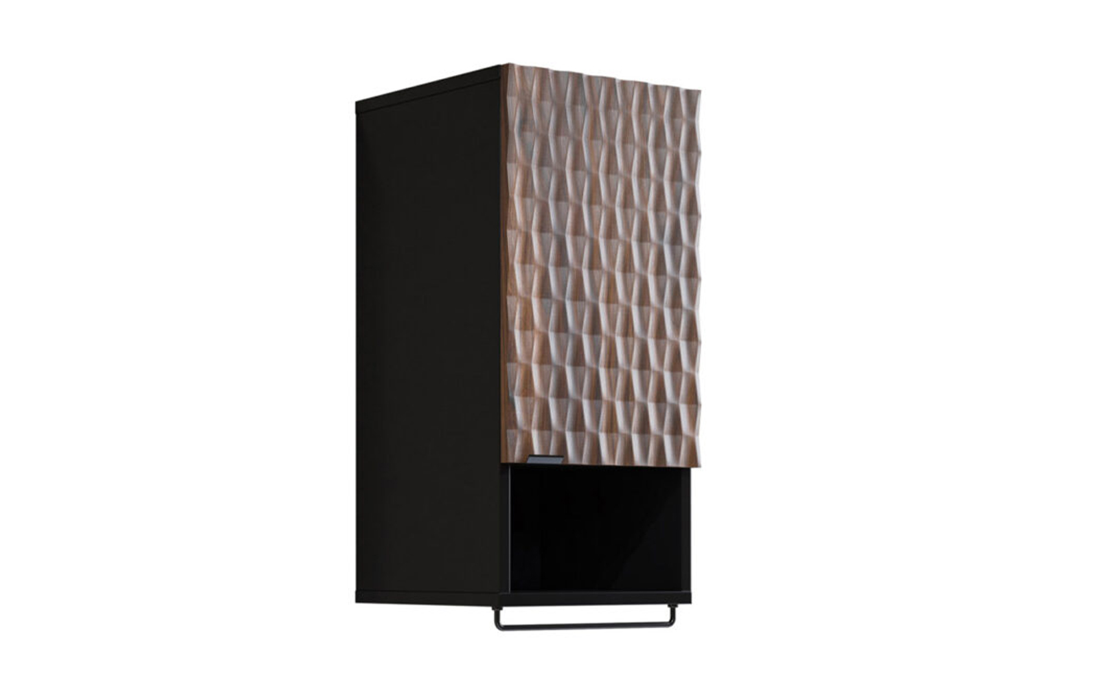 Fața din MDF Catania atrage atenția prin textura sa unică, cu reliefuri geometrice subtile, care adaugă profunzime și rafinament vizual. Această finisare sofisticată transformă dulapul într-un element decorativ deosebit, nu doar într-o simplă piesă funcțională. Carcasa în nuanță de onix negru aduce un contrast modern și elegant, potrivit atât pentru interioare minimaliste, cât și pentru băi decorate în stil contemporan sau industrial.