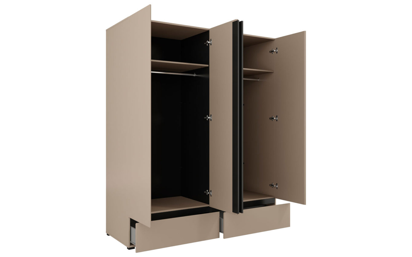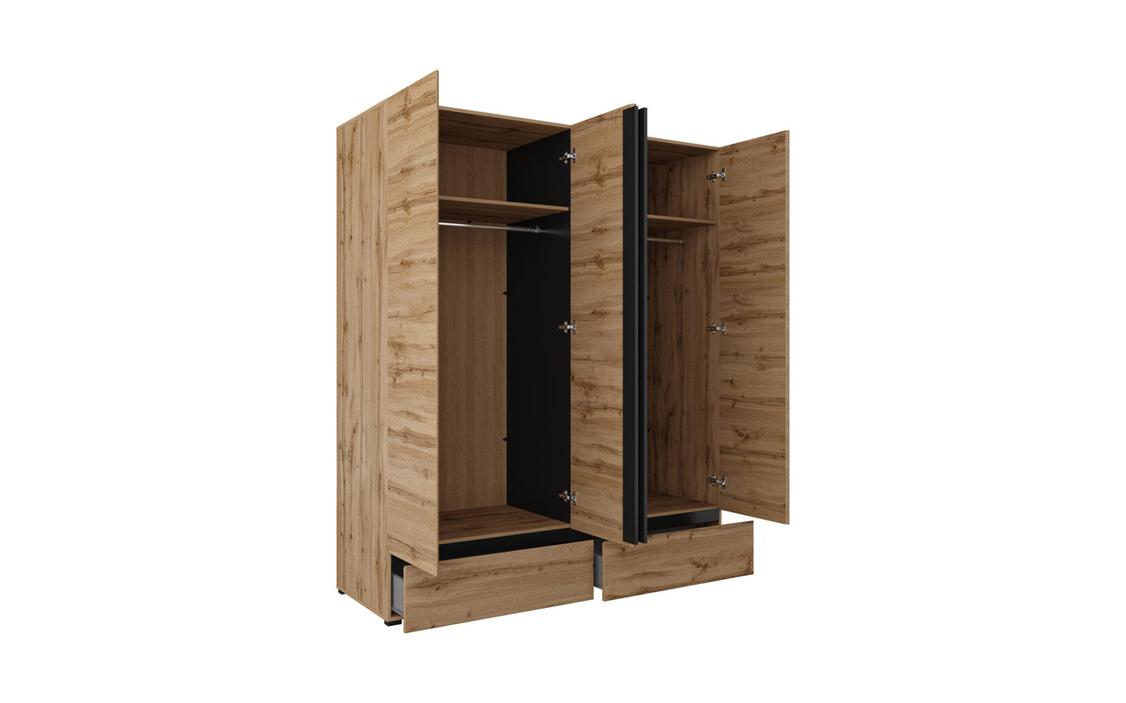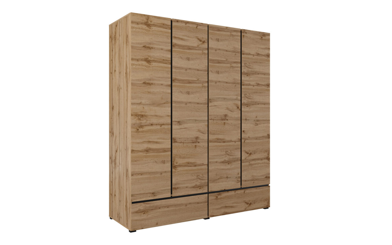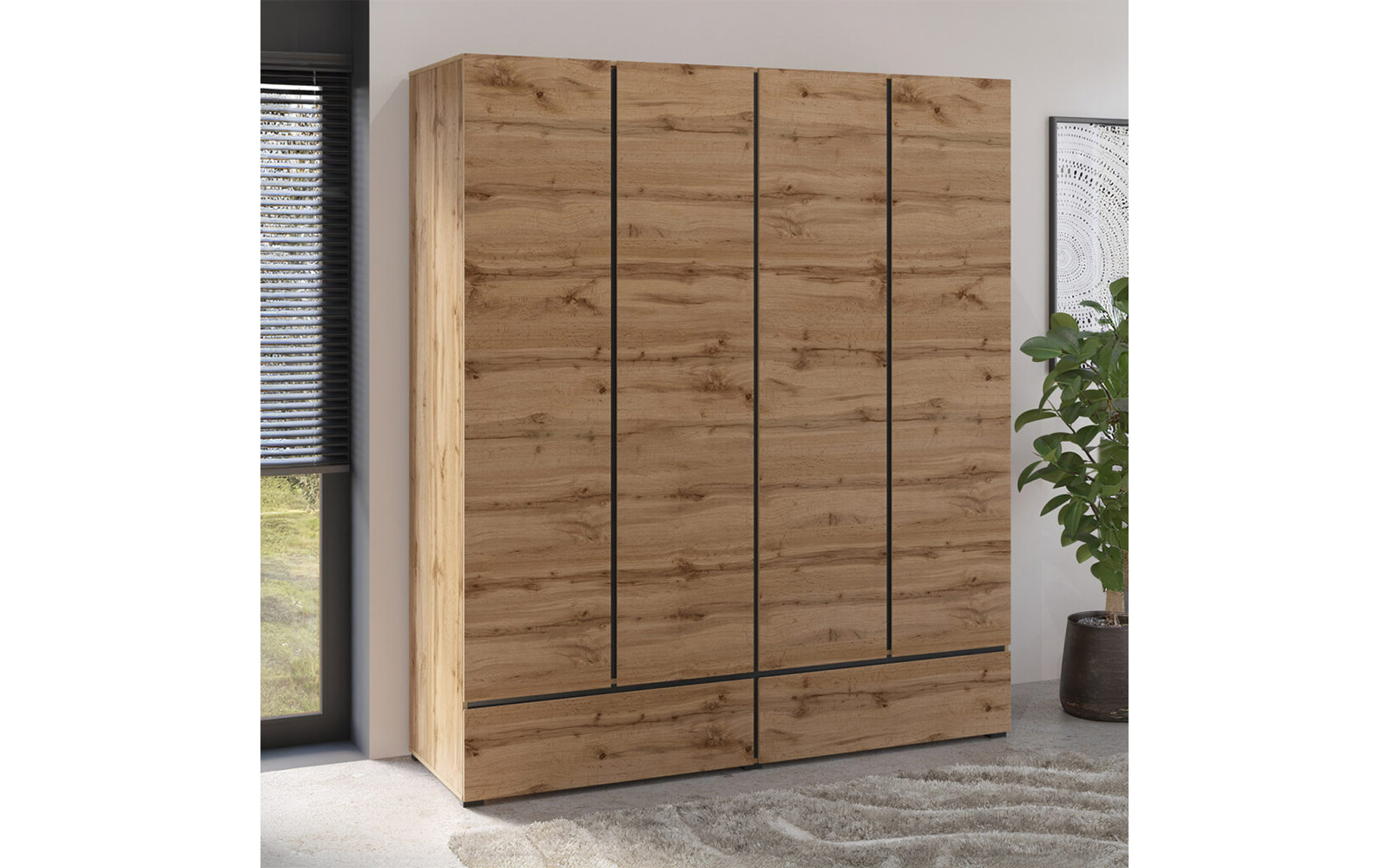 Cele patru uși spațioase ascund un interior bine compartimentat, ideal pentru organizarea eficientă a garderobei, de la haine lungi și delicate până la articole pliate. În partea inferioară, cele două sertare integrate oferă un spațiu suplimentar, perfect pentru lenjerie, accesorii sau obiecte de uz zilnic, menținând ordinea în dormitor și accesul rapid la toate articolele necesare.