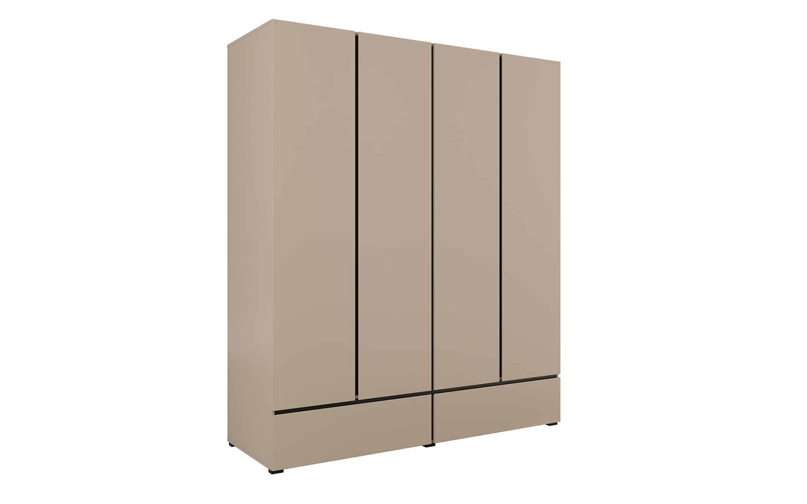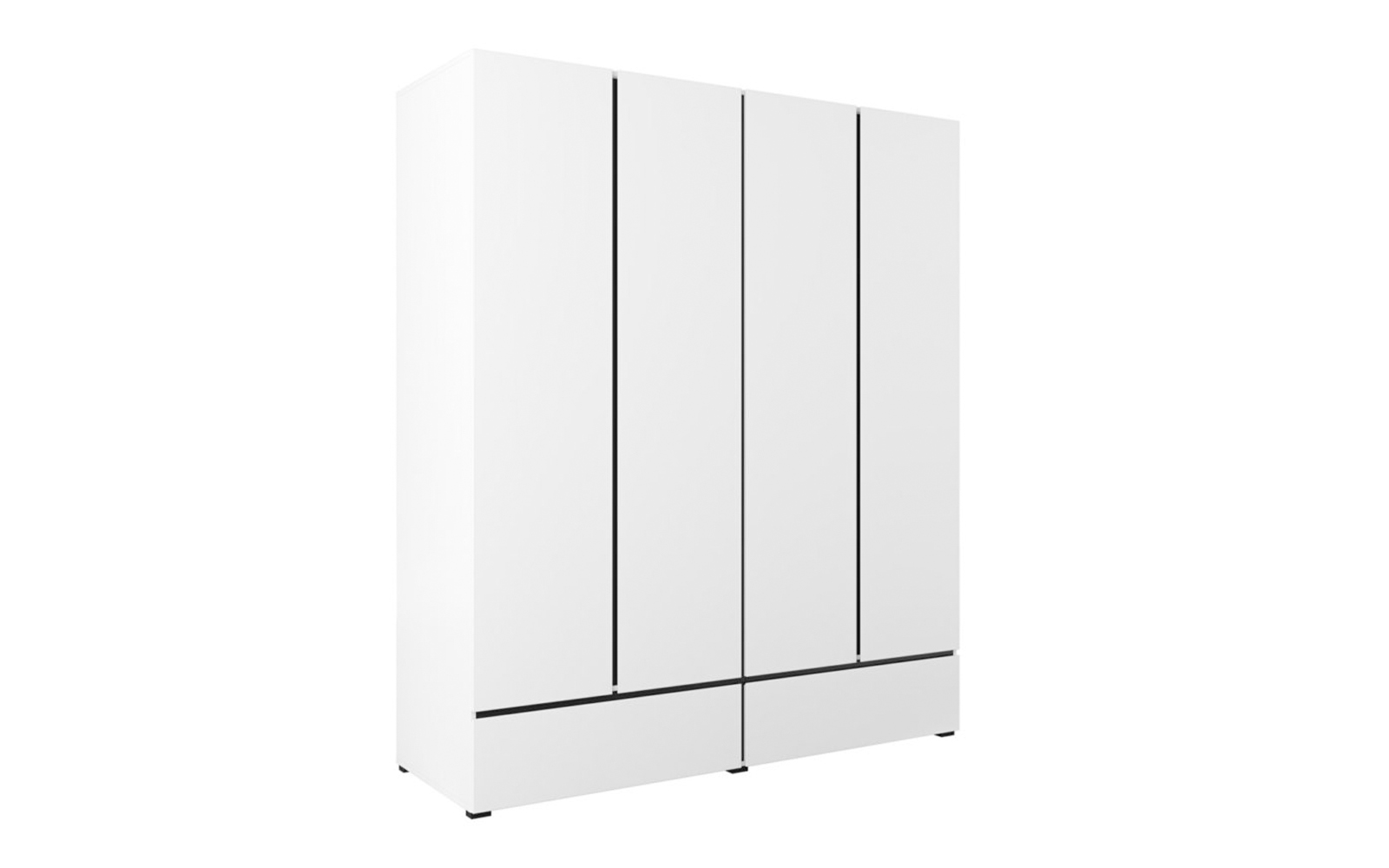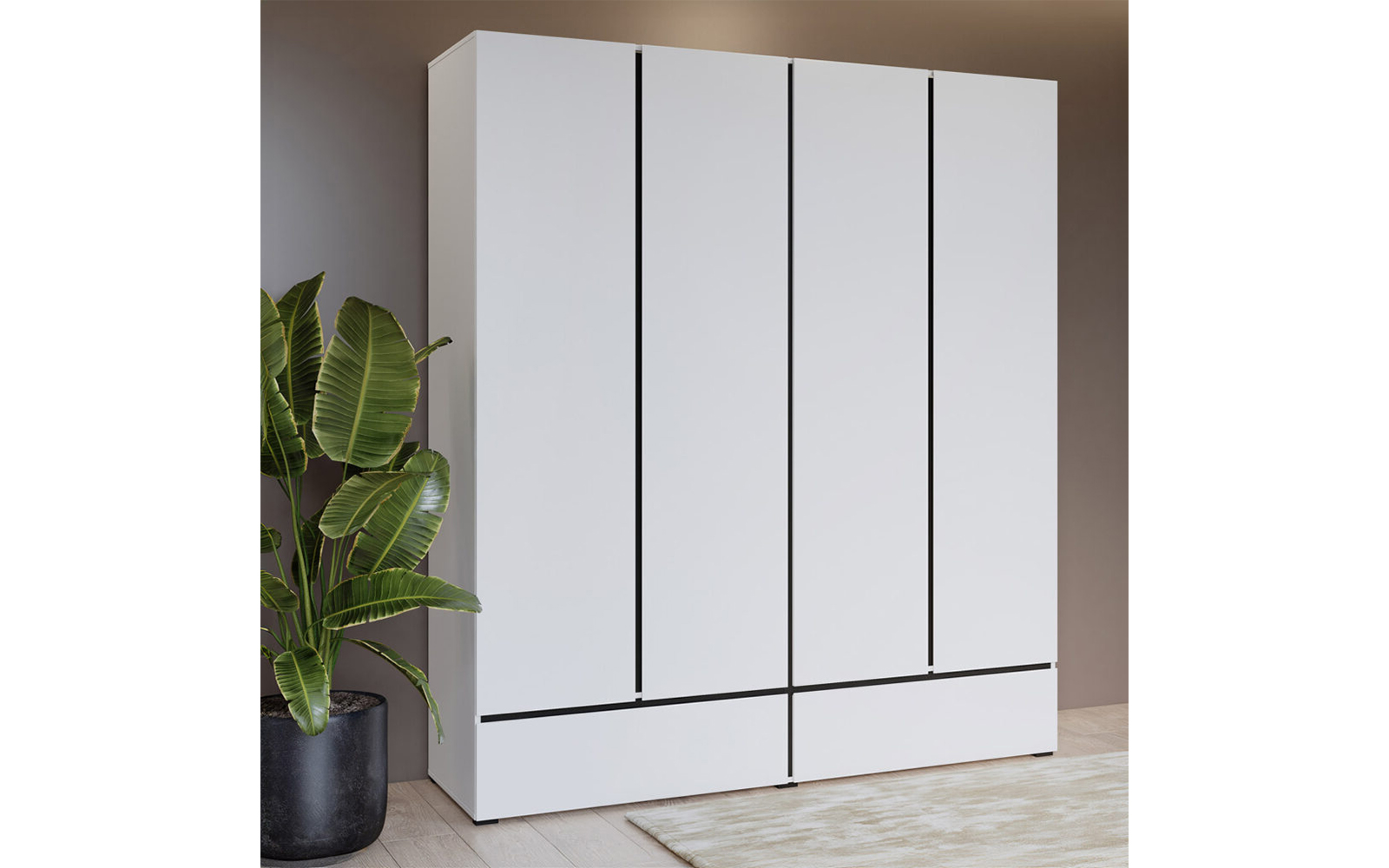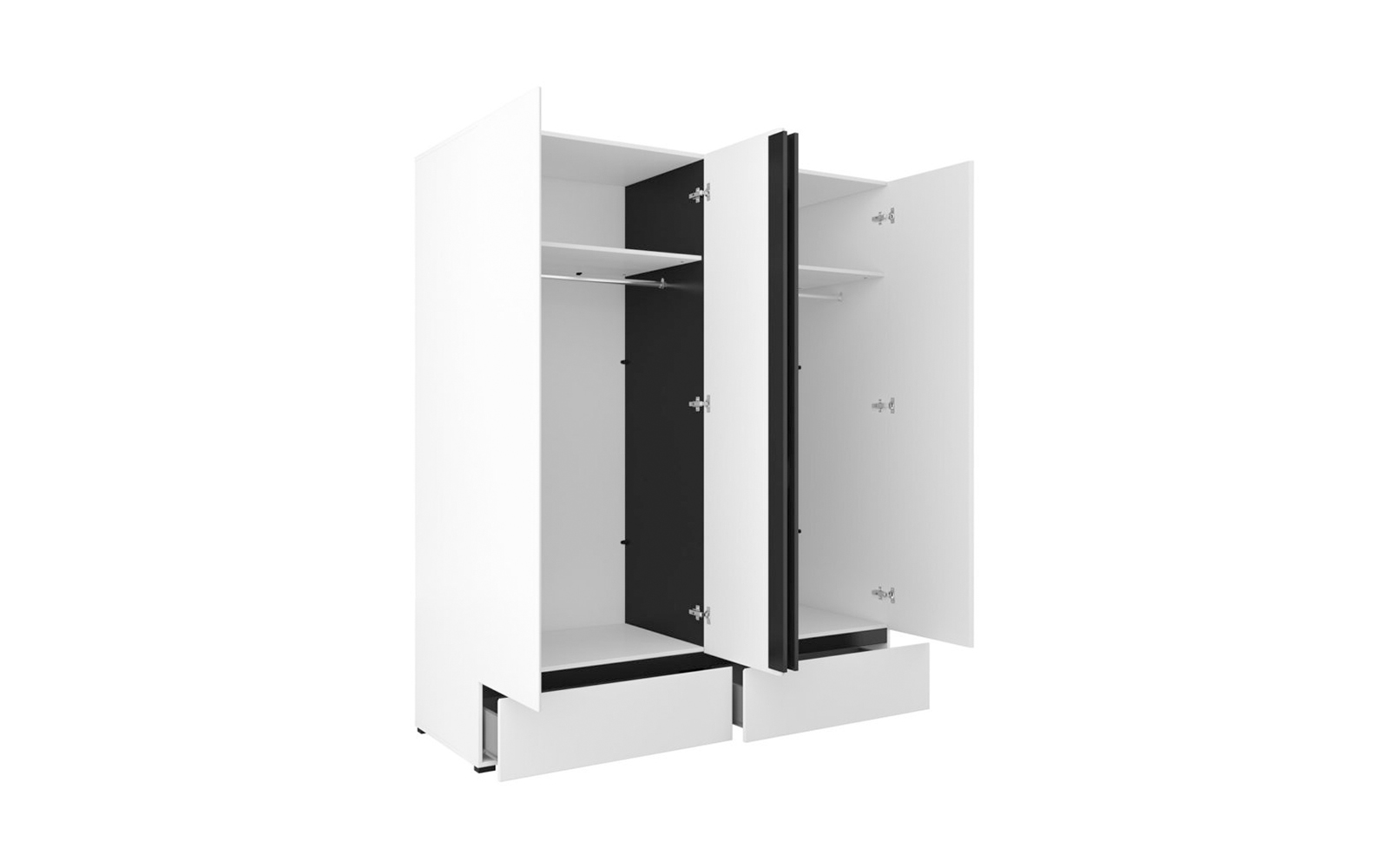 Cele patru uși spațioase ascund un interior bine compartimentat, ideal pentru organizarea eficientă a garderobei, de la haine lungi și delicate până la articole pliate. În partea inferioară, cele două sertare integrate oferă un spațiu suplimentar, perfect pentru lenjerie, accesorii sau obiecte de uz zilnic, menținând ordinea în dormitor și accesul rapid la toate articolele necesare.