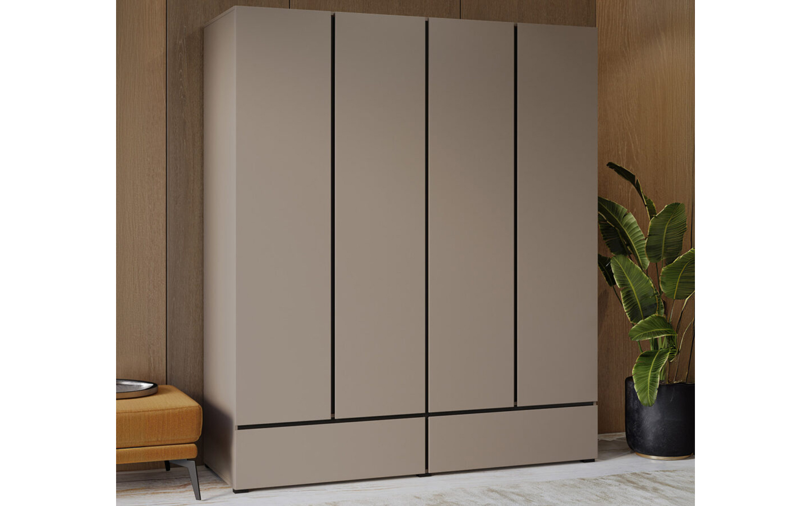 Dulapul Orion cu 4 uși și 2 sertare este o piesă de mobilier creată pentru a răspunde atât nevoilor de depozitare extinse, cât și cerințelor estetice ale unui dormitor modern. Cu un design contemporan, proporții echilibrate și linii minimaliste, acest dulap reușește să combine funcționalitatea practică cu un aspect elegant, perfect adaptabil diferitelor stiluri de amenajare interioară.