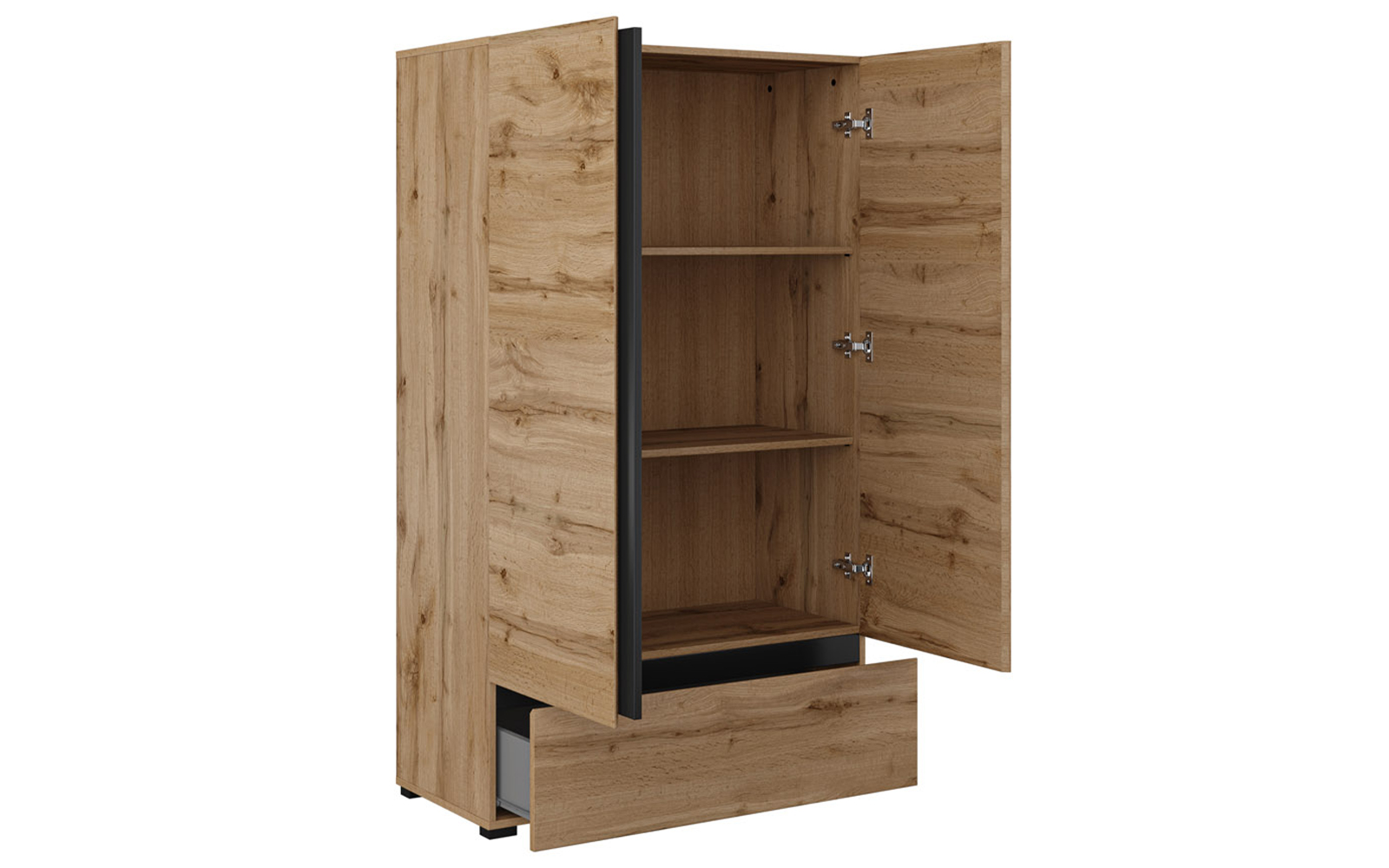 Spațiul interior, ascuns în spatele celor două uși, este dotat cu rafturi rezistente care permit organizarea eficientă a articolelor vestimentare, lenjeriei de pat, documentelor sau chiar a accesoriilor de zi cu zi. În partea inferioară, sertarul adaugă un plus de funcționalitate, oferind un loc ideal pentru depozitarea obiectelor mai mici, ce trebuie păstrate la îndemână, dar discret ascunse.