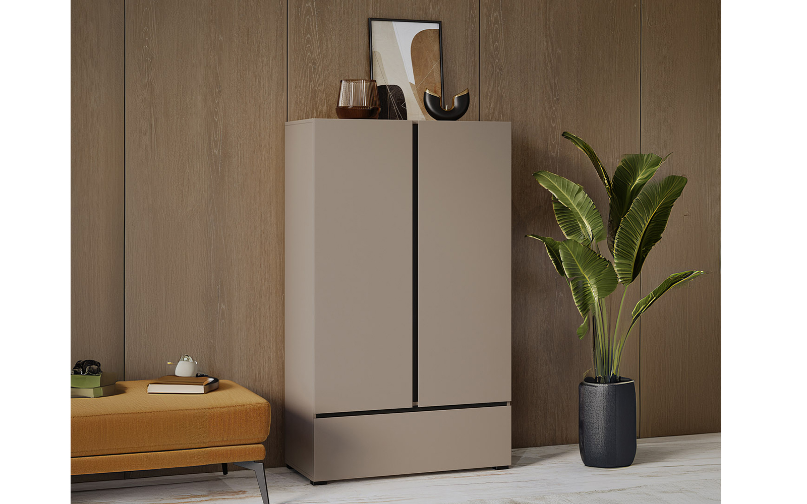 Un alt atu al acestui model este diversitatea cromatică disponibilă: finisaj cald de stejar Wotan, tonuri sofisticate de verde, bej Congo elegant și alb imaculat, fiecare variantă conferind o notă distinctă de personalitate spațiului. Suprafața netedă este ușor de curățat, iar mecanismele de deschidere sunt gândite pentru un confort sporit și o utilizare îndelungată.