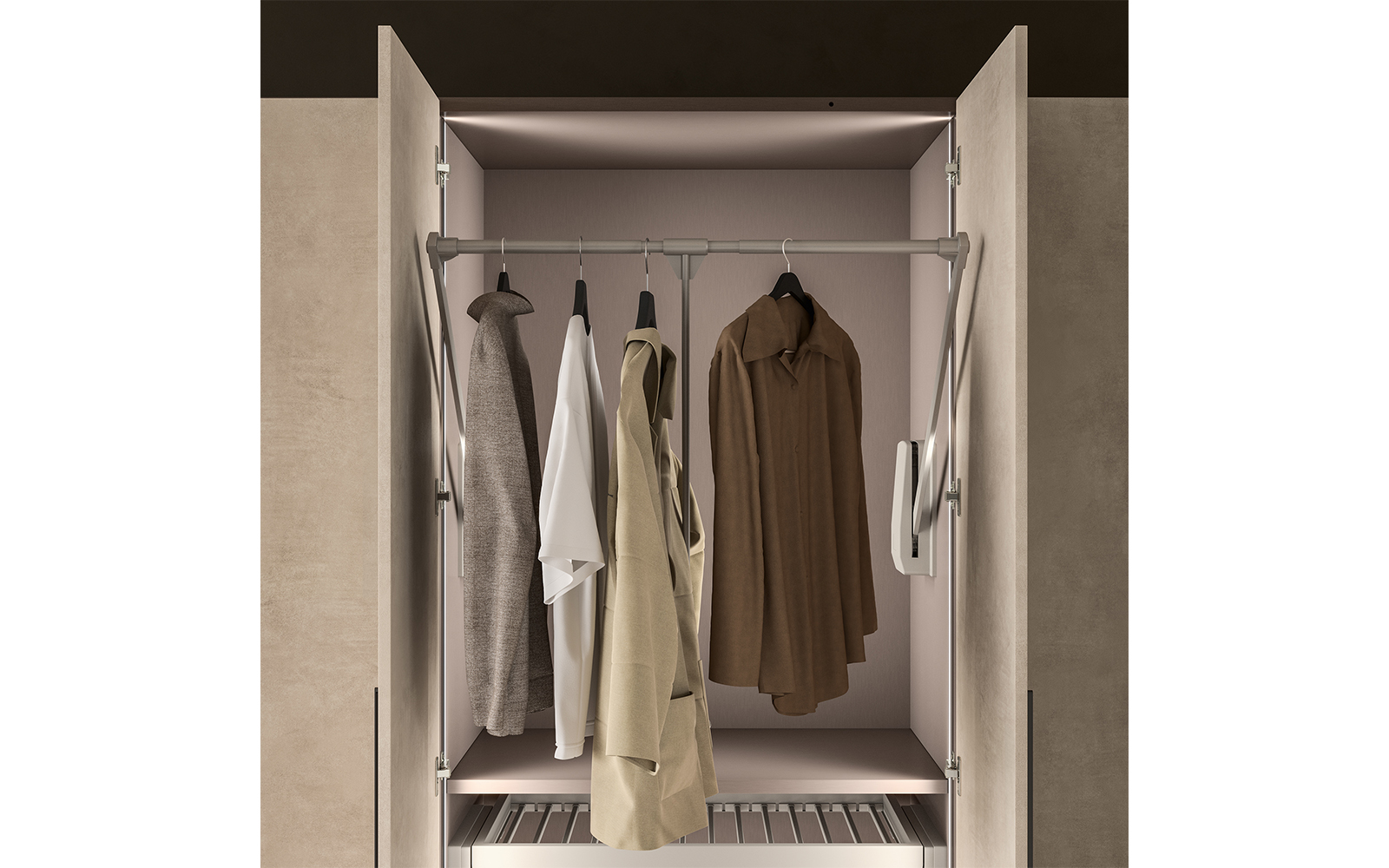 • Interior compartimentat inteligent, cu polițe, bara umerașe și sertare opționale în funcție de configurație