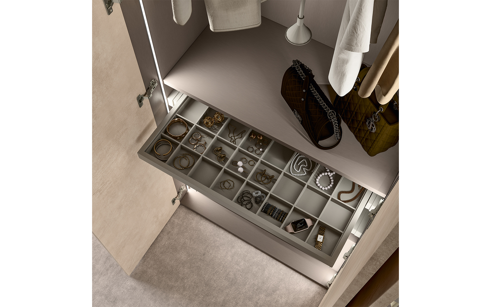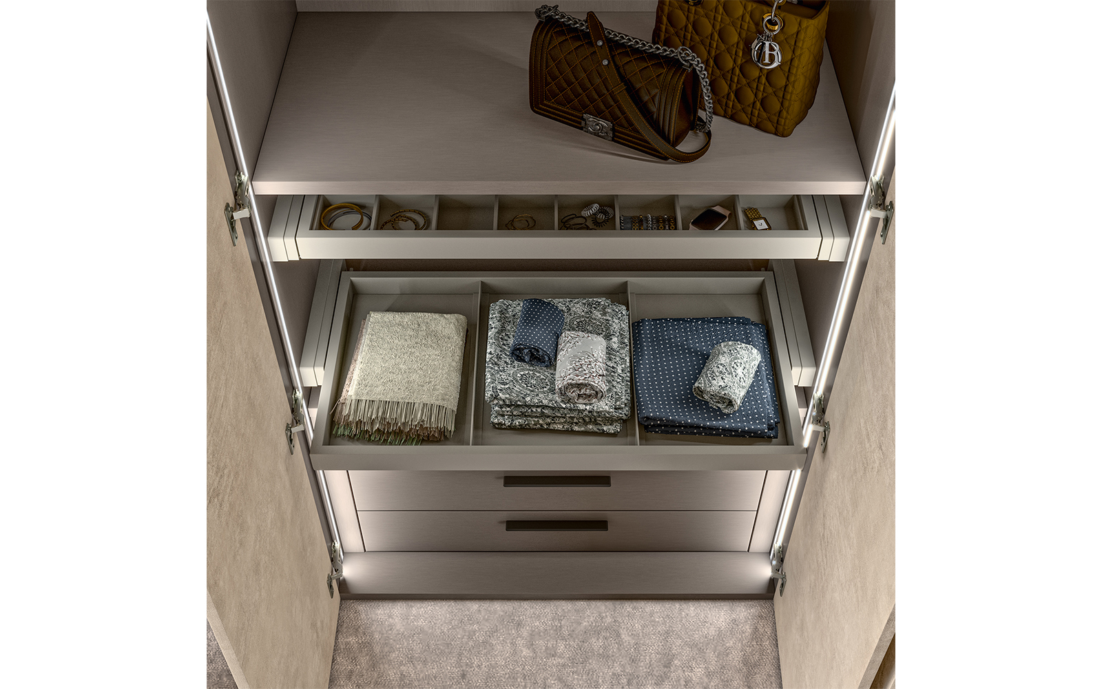 Interiorul este proiectat pentru a răspunde nevoilor reale ale utilizatorului, cu module interne ce pot fi configurate astfel încât să ofere spații bine delimitate pentru haine pe umerașe, articole pliate, încălțăminte sau accesorii. Variantele cu 3 uși sau mai mult includ opțional sisteme de iluminare LED integrate în interior, pentru un efect vizual spectaculos și o utilizare confortabilă, chiar și în absența luminii naturale. Variantele de 2 uși sunt disponibile în versiune standard (fără iluminare), dar pot fi, de asemenea, personalizate la cerere.