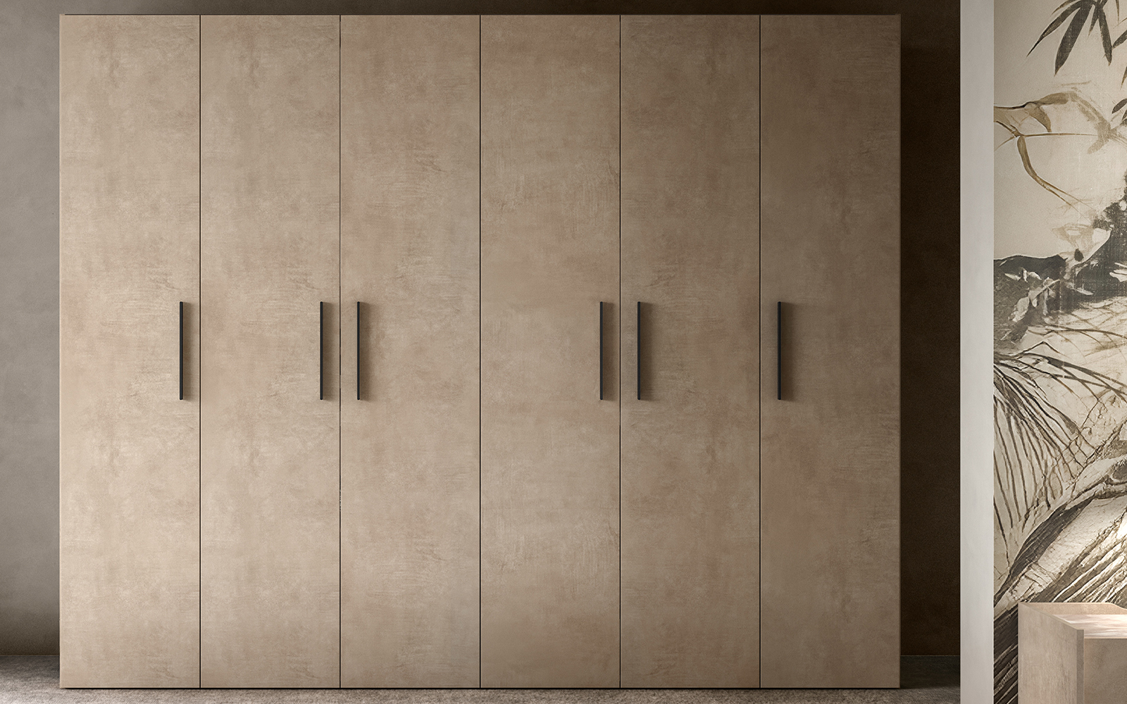 • Dulap premium cu fronturi decorative în nuanță naturală texturată, inspirată din tonurile nisipului fin