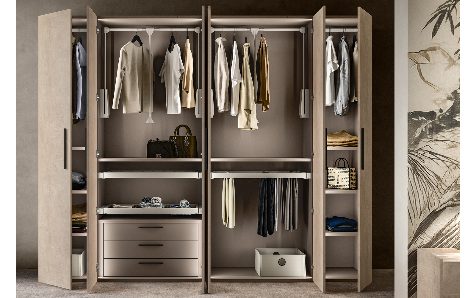 Este recomandat pentru dormitoare matrimoniale, spații ample de dressing, proiecte rezidențiale de lux sau amenajări ce urmăresc integrarea pieselor de mobilier în arhitectura spațiului, fără a altera liniile estetice dominante. Dulapul nu impune un stil, ci îl susține, contribuind la crearea unui ambient plăcut, ordonat și vizual echilibrat.