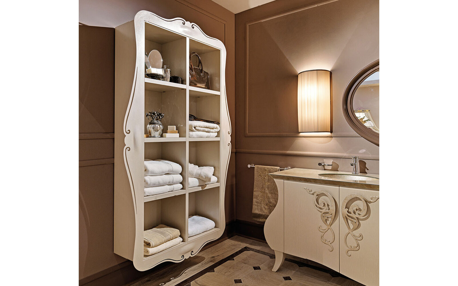 Disponibilă în finisaje variate și sofisticate, etajera Lord este perfectă pentru a completa mobilierul de baie clasic (ex: modelele Glamour sau Marchese), dar se integrează excelent și în dressinguri, holuri sau dormitoare elegante, adăugând stil și funcționalitate în orice ambient.