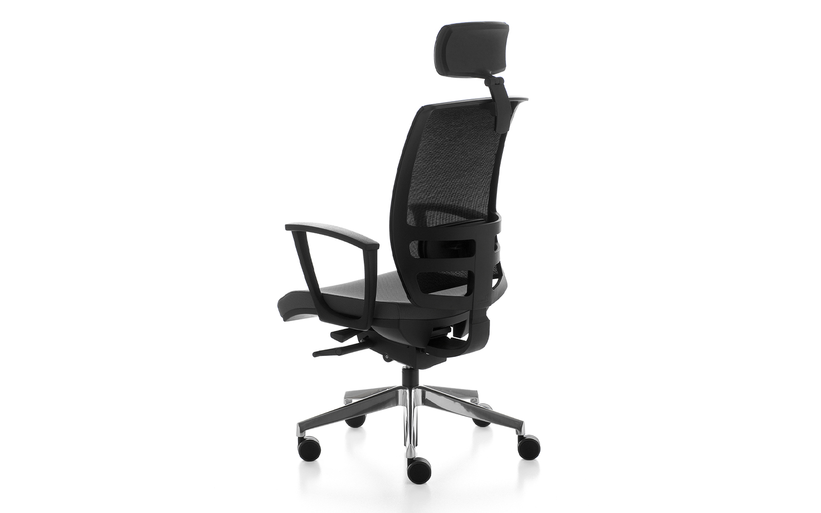 Spătarul este fabricat din poliamidă ranforsată, acoperit cu plasă din poliester elastic, ce oferă ventilație și flexibilitate. Este echipat cu suport lombar reglabil pe înălțime și adâncime, pentru o susținere adaptată coloanei vertebrale. Opțional, poate fi completat cu tetieră reglabilă pe înălțime și rotire, disponibilă în versiuni albă sau neagră.