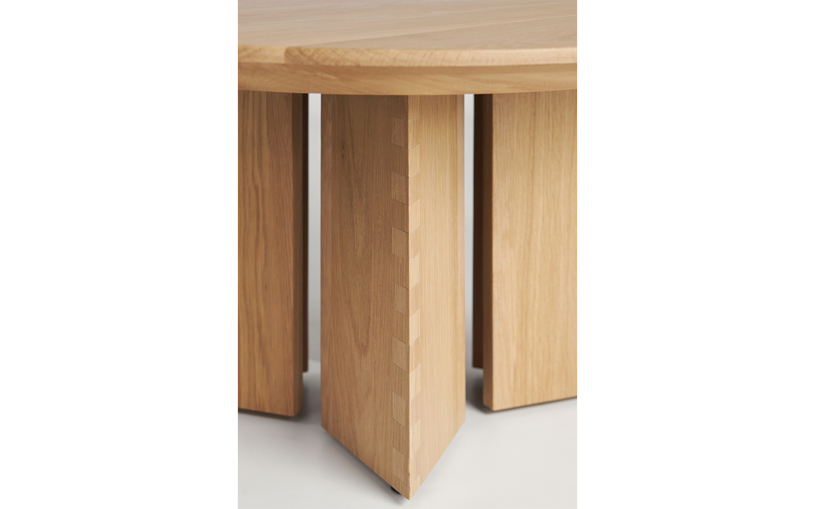 Un detaliu de design deosebit este îmbinarea Finger Joint utilizată în construcția picioarelor. Acest element, specific lucrărilor de tâmplărie de înaltă clasă, are o dublă valoare: pe de o parte, adaugă rezistență și stabilitate structurală, iar pe de altă parte devine un accent vizual, punând în evidență frumusețea execuției manuale și măiestria meșteșugului tradițional reinterpretat într-un limbaj contemporan.