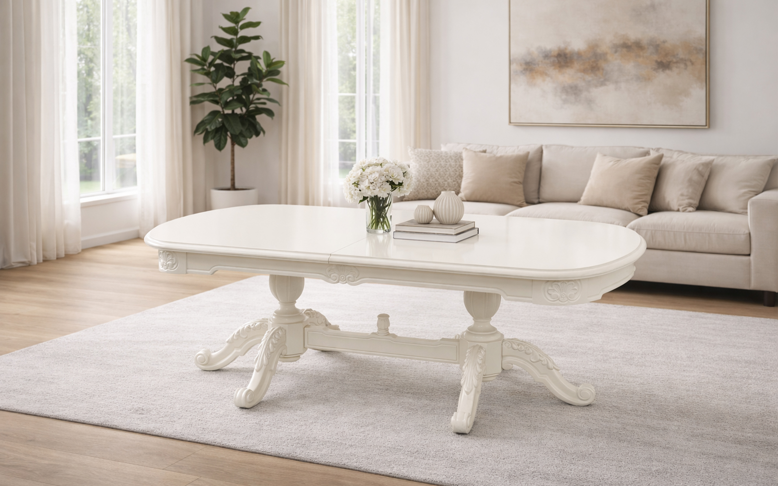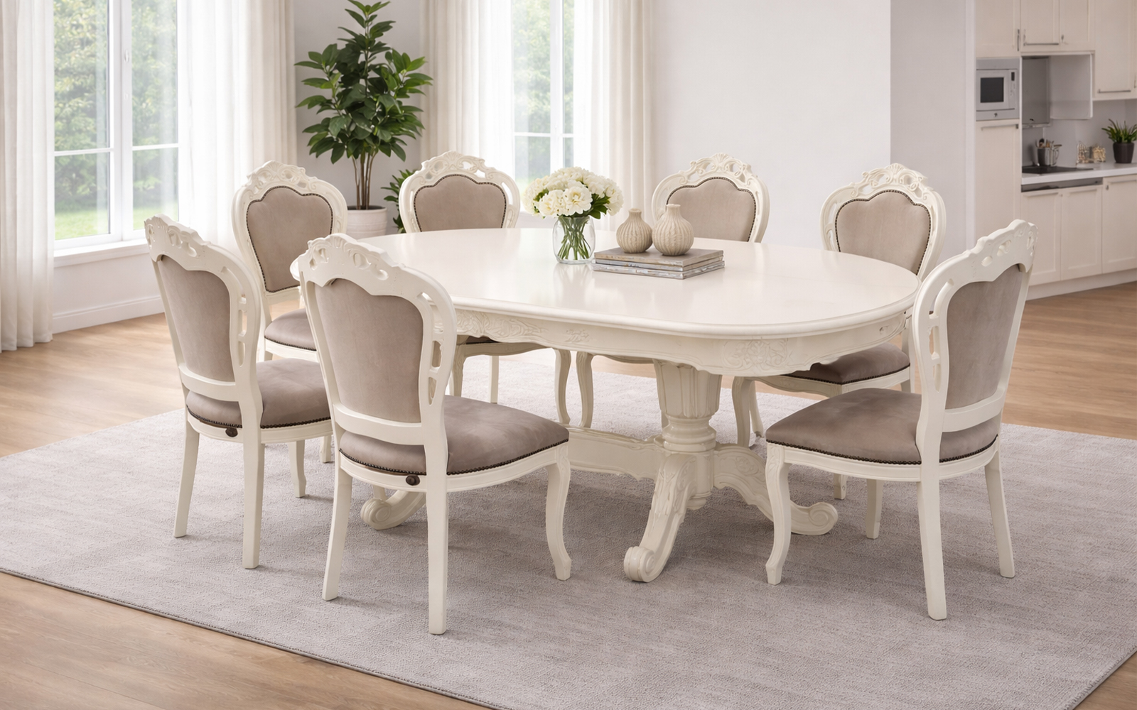 Realizată cu o atenție deosebită la detalii, masa Briston impresionează prin liniile sale fluide, blatul generos cu margini rotunjite și baza sculptată manual, care adaugă profunzime și caracter fiecărui spațiu. Finisajul alb lucios contribuie la o atmosferă luminoasă și aerisită, fiind ușor de integrat în amenajări sofisticate, dar și în combinații moderne cu accente clasice.