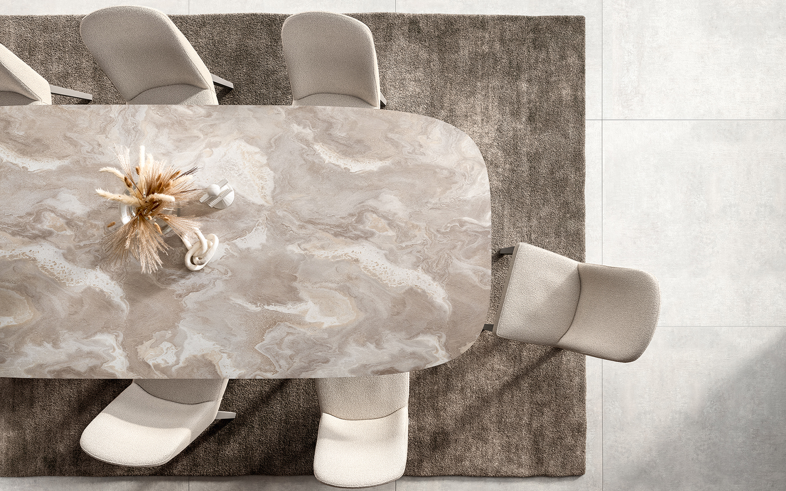 Masa se poate combina armonios cu scaunele tapițate din colecția Sable sau cu piese din alte colecții cu finisaje naturale, pentru amenajări în tonuri liniștite, sofisticate. Este ideală pentru proiecte de design interior axate pe materiale autentice, spații ample cu lumină naturală sau compoziții orientate spre minimalism cald. Se livrează preasamblată parțial sau cu instrucțiuni de montaj în funcție de variantă, iar marmura este tratată pentru utilizare frecventă, păstrând totodată aspectul natural.