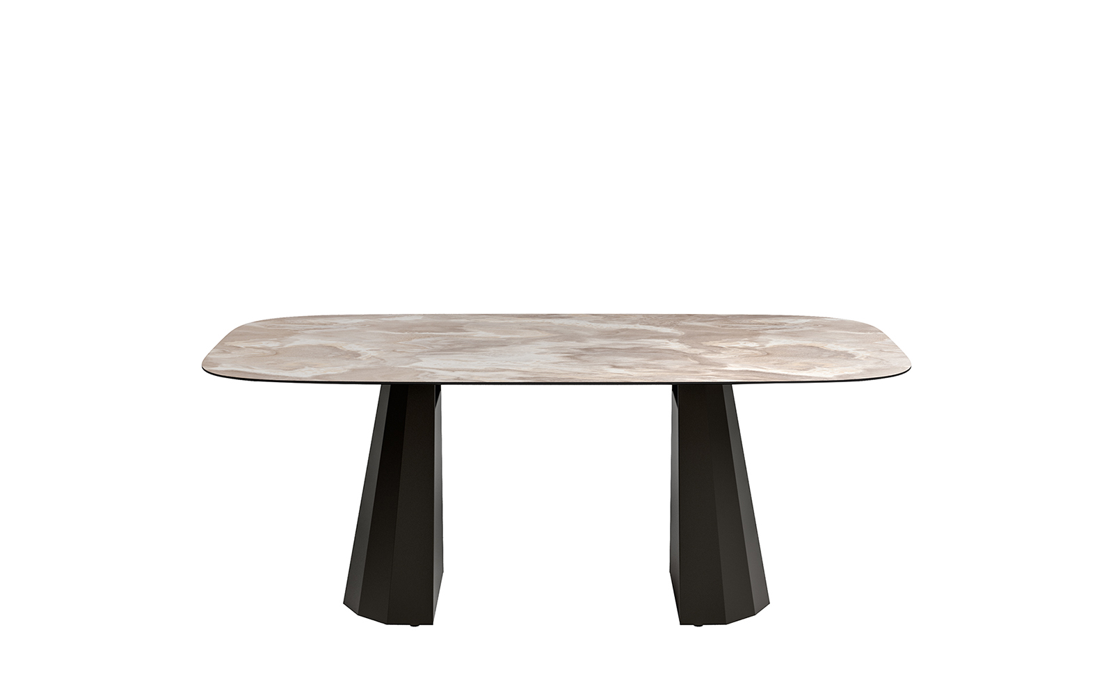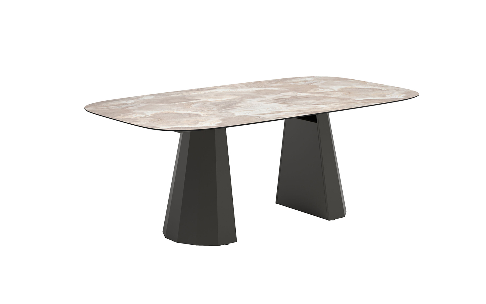 Structura de susținere a blatului este realizată din elemente metalice foarte stabile, având o formă sculpturală cu bază conică, finisată în tonuri neutre, ușor de integrat în diverse stiluri de mobilier. Designul bazei este gândit astfel încât să distribuie uniform greutatea marmurei și să ofere stabilitate fără a încărca vizual compoziția. Lipsa picioarelor tradiționale permite libertate în poziționarea scaunelor și confort sporit pentru utilizator.