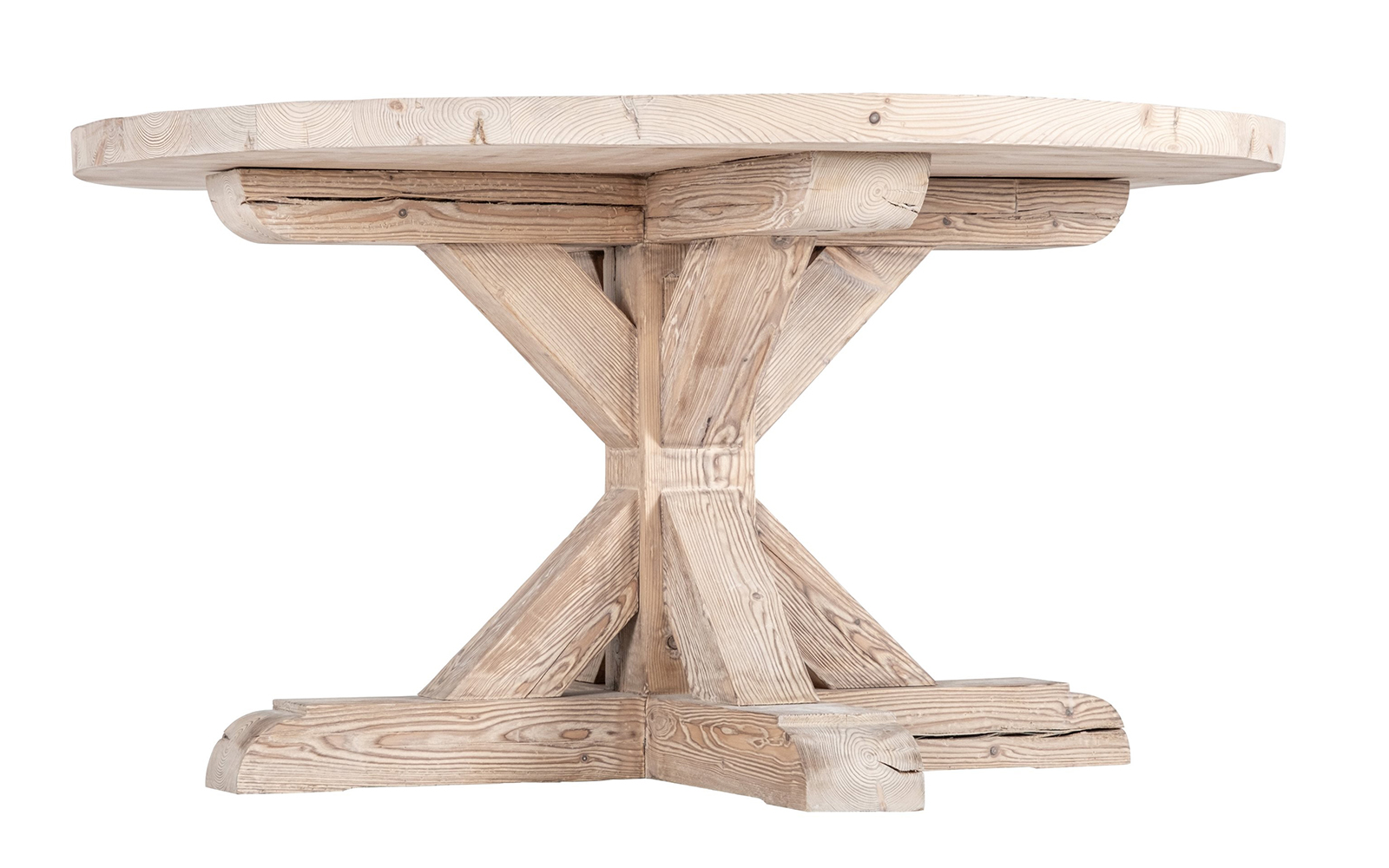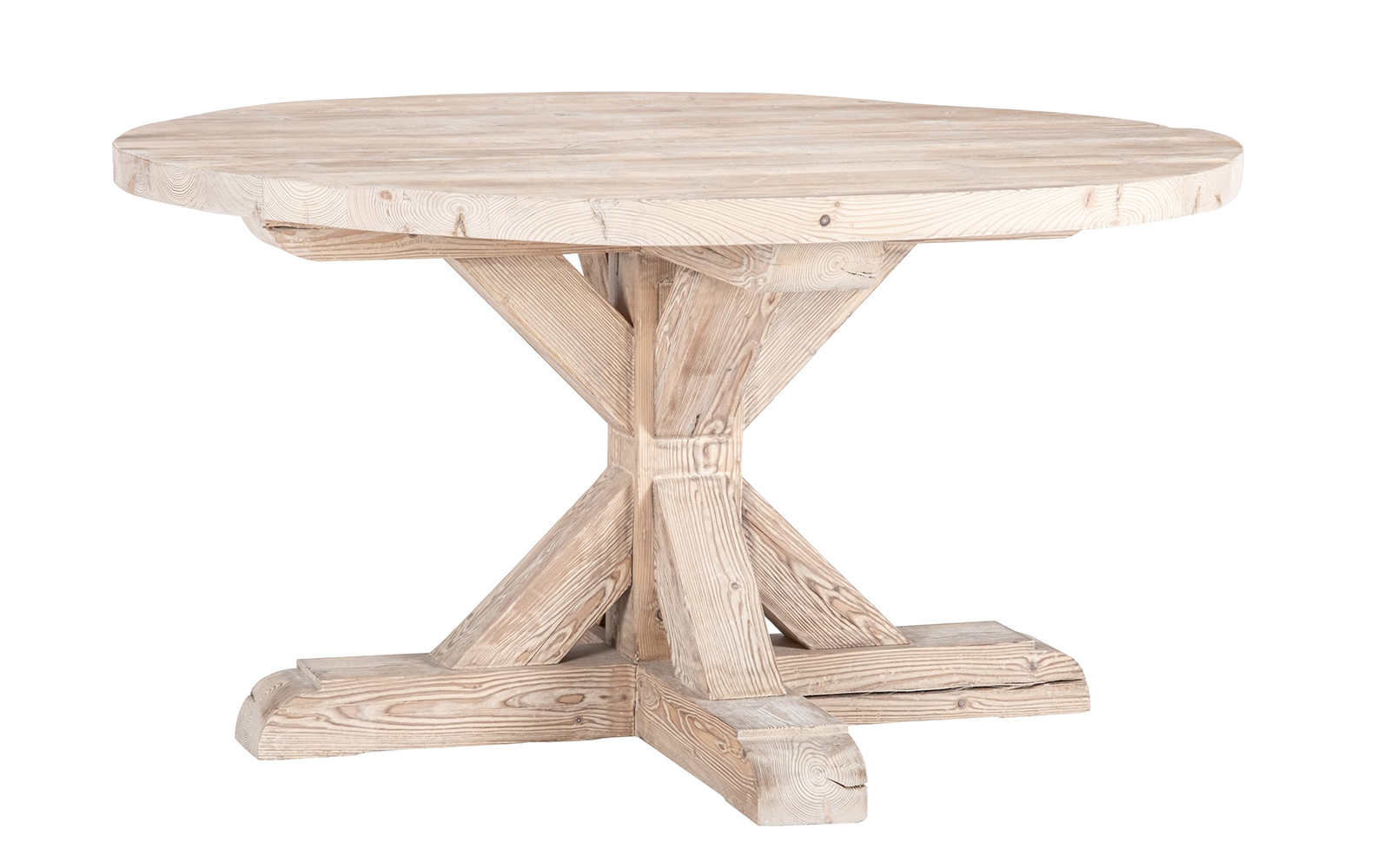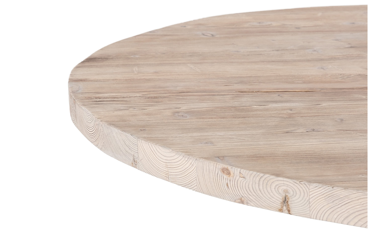 Blatul rotund este realizat din pin masiv recuperat, atent selecționat pentru a păstra fibra naturală, nodurile și imperfecțiunile care definesc farmecul lemnului vechi. Forma circulară creează o atmosferă primitoare și facilitează interacțiunea la masă, fiind ideală pentru întâlniri relaxate în familie sau cu prietenii.