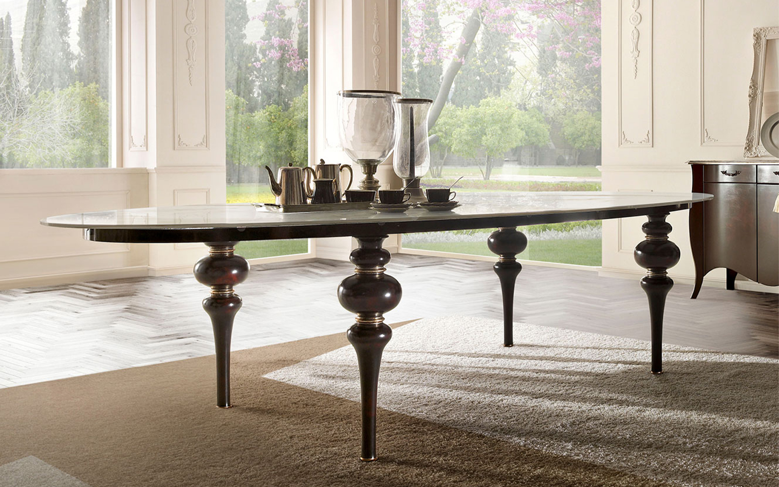 Masă ovală de dining cu picioare sculptate și contururi clasice