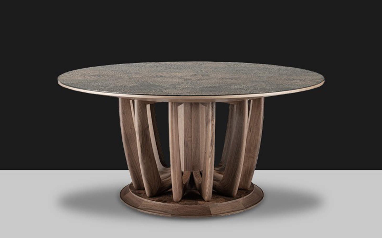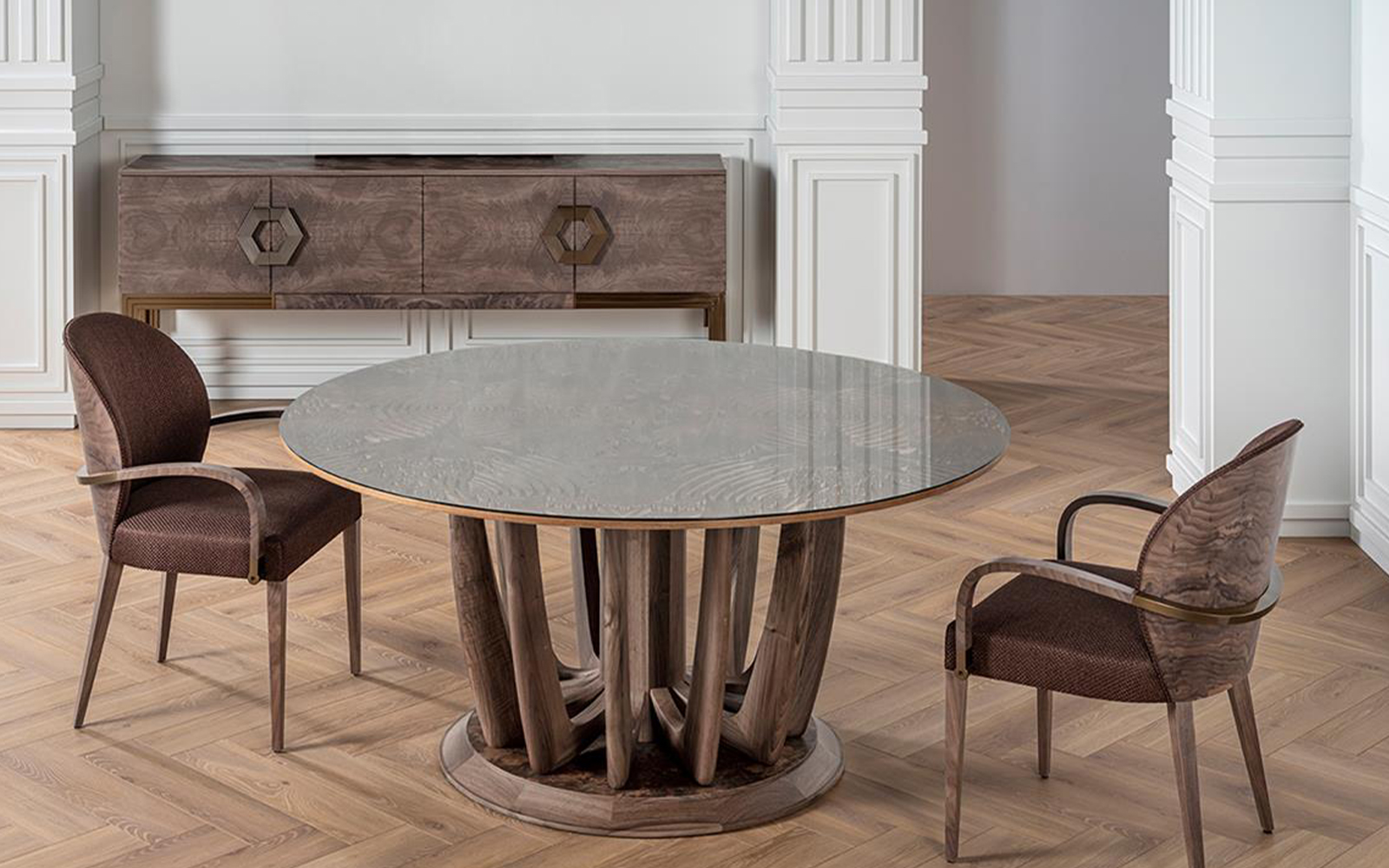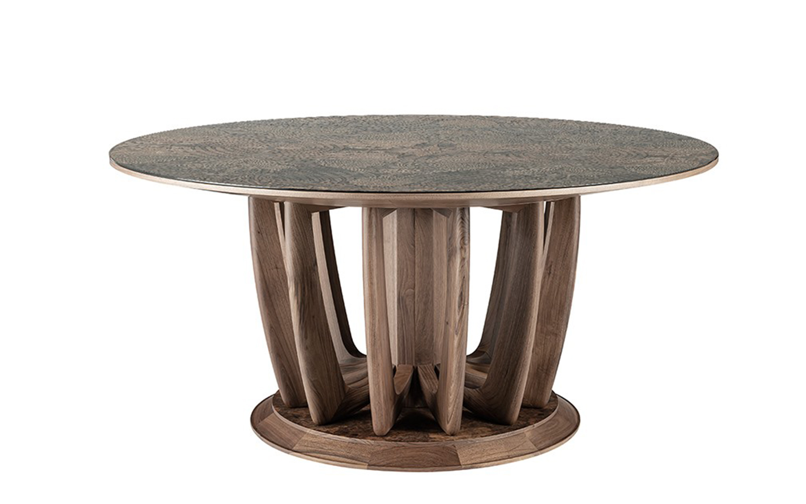 Masa TROPICANA în varianta rotundă redefinește eleganța naturală printr-un echilibru între formă, material și detaliu artistic. Realizată din lemn masiv de nuc, considerat unul dintre cele mai rare și apreciate materiale lemnoase, această piesă impresionează prin blatul cu gravură decorativă și prin baza arhitecturală cu elemente curbate lucrate manual.